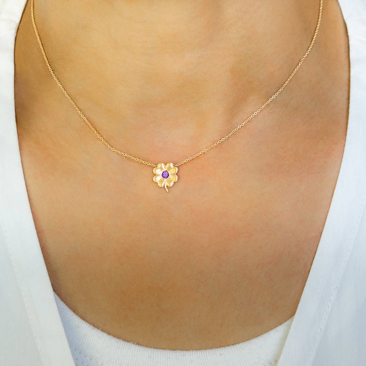 Amethyst is symbolic of protection. It is worn to protect people, quiet the mind and help control addictions. When worn in jewelry, amethyst can improve the wearer's health and well-being. The clover motif is a timeless symbol of good luck and fortune, making these necklaces not only beautiful but also infused with positive energy. At the heart of each clover pendant rests a genuine birthstone, adding a personal touch and a connection to your birth month's unique energies. The understated yet chic design makes these necklaces versatile accessories that effortlessly transition from day to night, from casual to formal occasions. Whether for yourself or a loved one, these gold clover necklaces with center birthstones are perfect for commemorating special moments and milestones. Perfect as a layering necklace, a girl's first gold necklace or as a sweet 16 gift for teens.