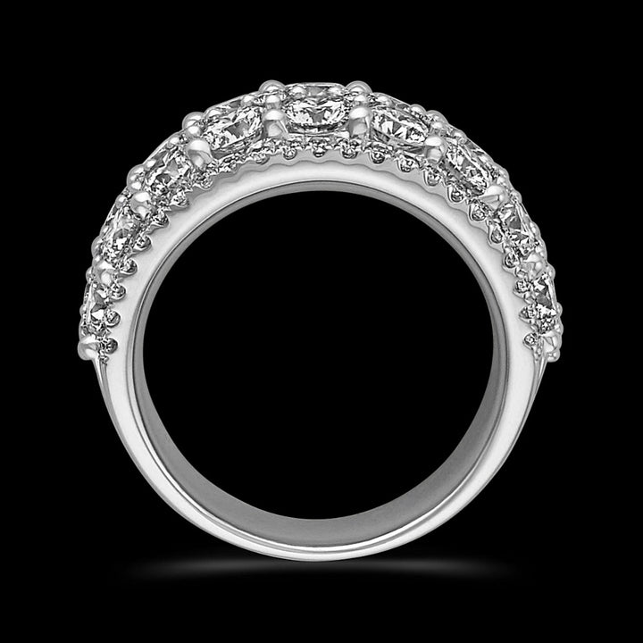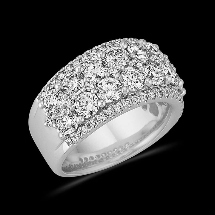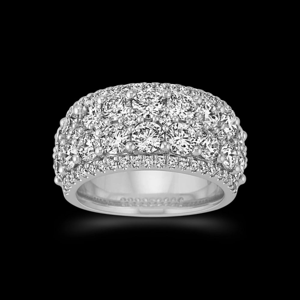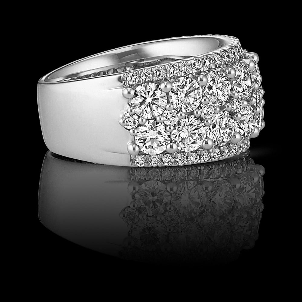 Since 1929, the Shane family have expertly crafted fine jewelry for life's most special moments. Tom Shane and his son, Rordan, uphold the legacy of being your friend in the jewelry business. The one you can trust to help you shine brighter every day. Rooted in quality craftsmanship and a fervent pursuit of the most beautiful gemstones, Shane Co. ensures your love story is in good hands. They are here for you for a lifetime, because they are in it for a lifetime. Let Shane Co. help you find jewelry that feels like you.Style notes: Where regal elegance and striking beauty meet is found displayed by this ravishing ring. This stunning band radiates a total of 74 round natural diamonds, at approximately 4.16 carats total weight, pavé-set in quality 14 karat white gold. A center two rows feature larger natural diamonds that are beautifully supported by brilliant smaller natural diamonds. Each natural diamond has been hand-matched for consistent fire and color.Price: Please note price may vary due to exchange rate differences or shipping, duties and taxes. Price may also vary with materials choice. Final price is calculated at checkout at the designer's website. Materials: 14k white gold with 4.16ctw diamonds.