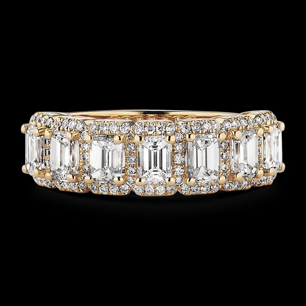 Since 1929, the Shane family have expertly crafted fine jewelry for life's most special moments. Tom Shane and his son, Rordan, uphold the legacy of being your friend in the jewelry business. The one you can trust to help you shine brighter every day. Rooted in quality craftsmanship and a fervent pursuit of the most beautiful gemstones, Shane Co. ensures your love story is in good hands. They are here for you for a lifetime, because they are in it for a lifetime. Let Shane Co. help you find jewelry that feels like you.Style notes: A shimmering halo illuminates each of the emerald cut natural diamonds in this exquisite ring for maximum shine. Set in warm 14-karat yellow gold, all the natural diamonds are hand matched for consistent color, clarity, and beauty.Price: Please note price may vary due to exchange rate differences or shipping, duties and taxes. Price may also vary with materials choice. Final price is calculated at checkout at the designer's website. Materials: 14k yellow gold with 1.65ctw emerald cut diamonds and 0.25ctw round natural diamonds. Dimensions: Approx. 3.3mm band width