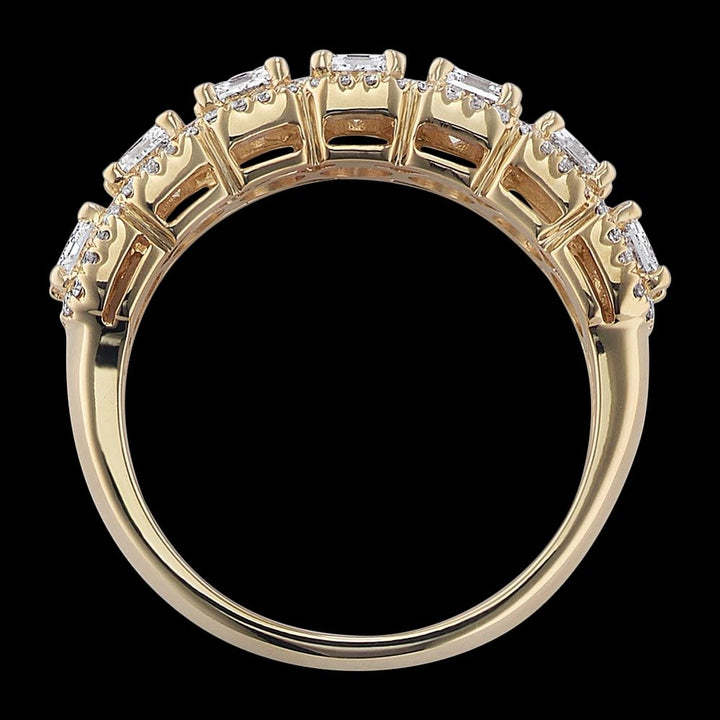 14k yellow gold with 1.65ctw emerald cut diamonds and 0.25ctw round natural diamonds. Dimensions: Approx. 3.3mm band width