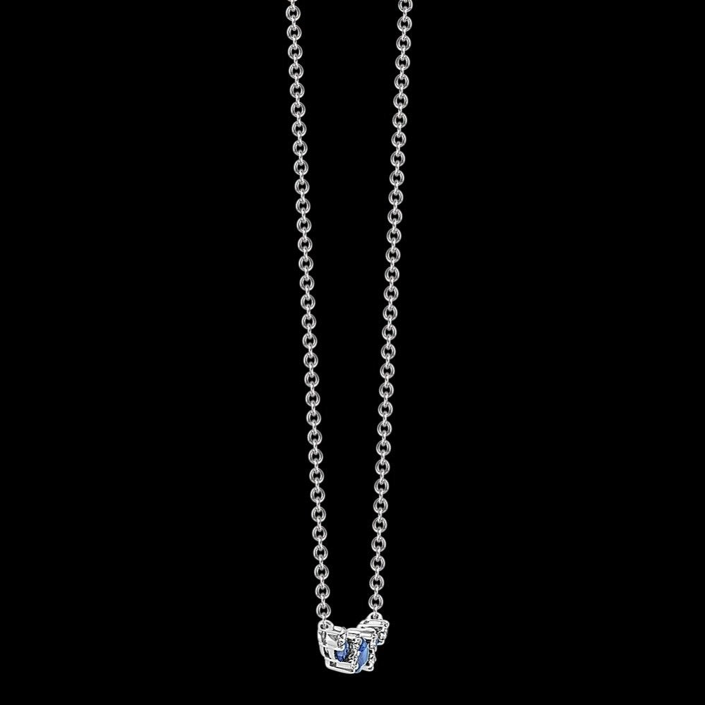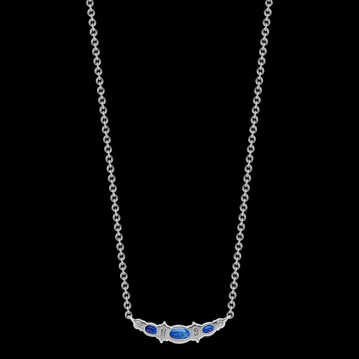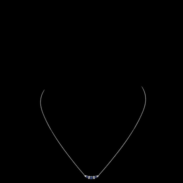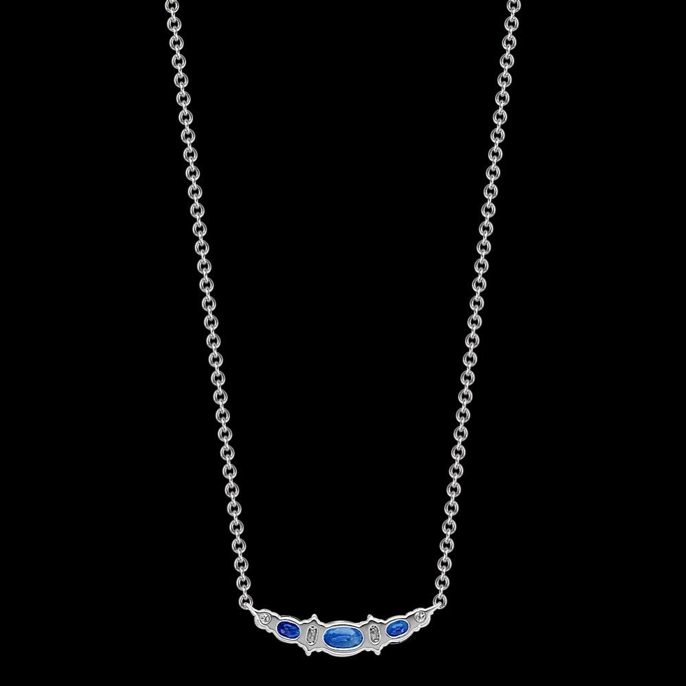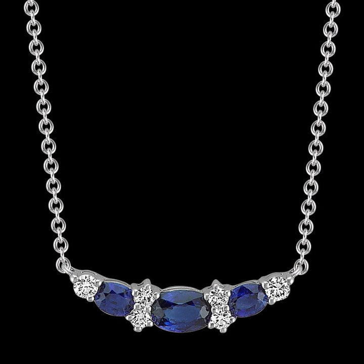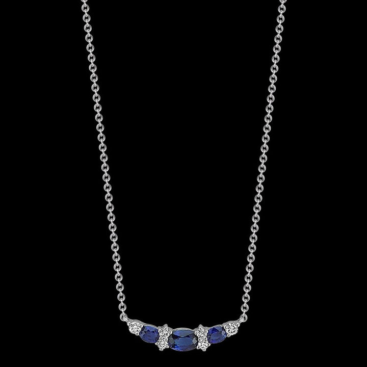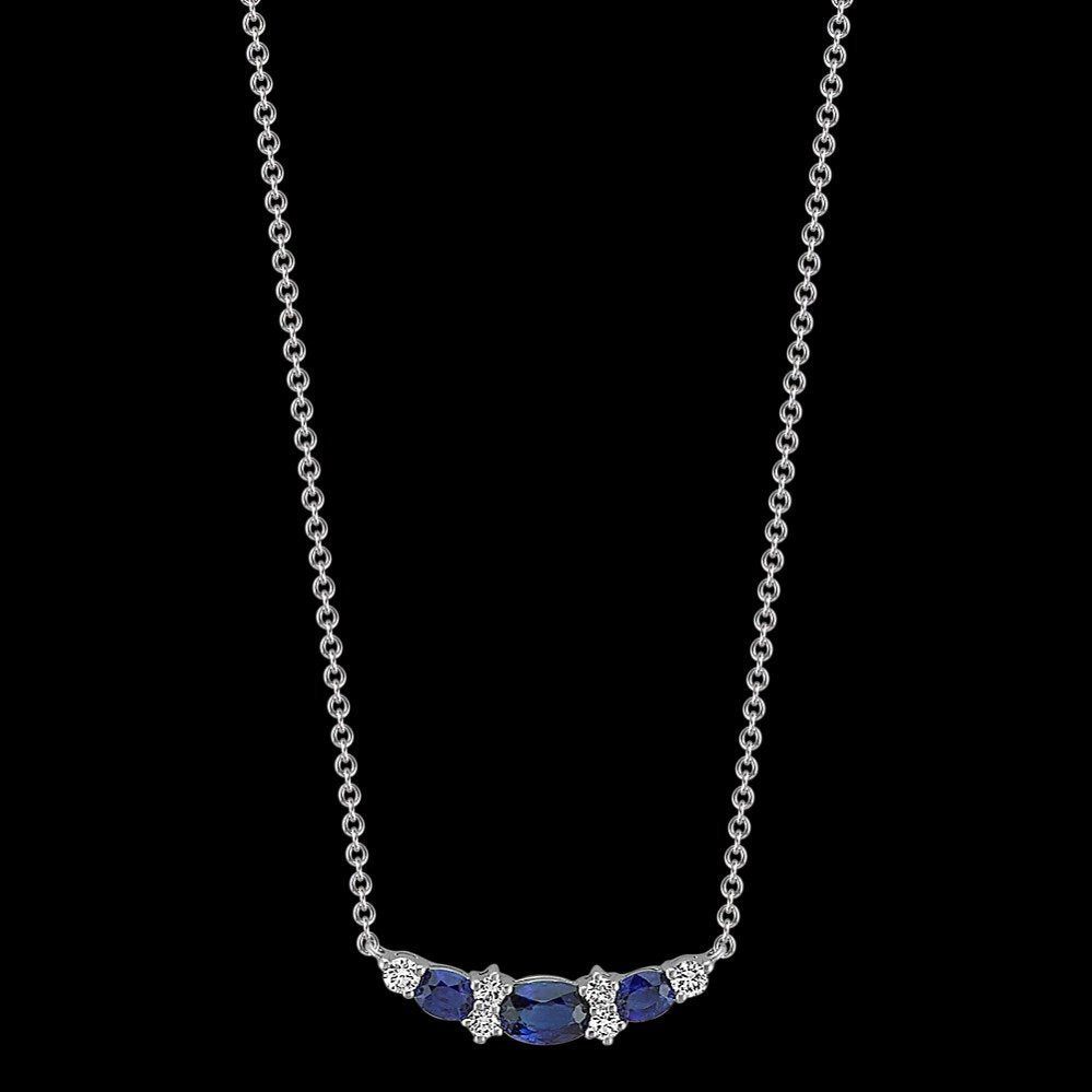 Since 1929, the Shane family have expertly crafted fine jewelry for life's most special moments. Tom Shane and his son, Rordan, uphold the legacy of being your friend in the jewelry business. The one you can trust to help you shine brighter every day. Rooted in quality craftsmanship and a fervent pursuit of the most beautiful gemstones, Shane Co. ensures your love story is in good hands. They are here for you for a lifetime, because they are in it for a lifetime. Let Shane Co. help you find jewelry that feels like you.Style notes: Three oval traditional natural sapphires (approx. .99 carat), are the gorgeously highlighted by six brilliant round natural diamonds (approx. .19 carat TW), in this elegant necklace. Crafted from quality 14 karat white gold, the design measures 7/8 of an inch wide and hangs on an adjustable 18-inch rolo chain. The total gem weight is approximately 1.18 carats.Price: Please note price may vary due to exchange rate differences or shipping, duties and taxes. Price may also vary with materials choice. Final price is calculated at checkout at the designer's website. Materials: 14k white gold with .99ctw blue sapphires and .19ctw diamonds.Dimensions: 7/8 of an inch wide and hangs on an adjustable 18-inch rolo chain.