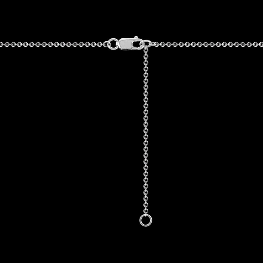 14k white gold with .99ctw blue sapphires and .19ctw diamonds.Dimensions: 7/8 of an inch wide and hangs on an adjustable 18-inch rolo chain.