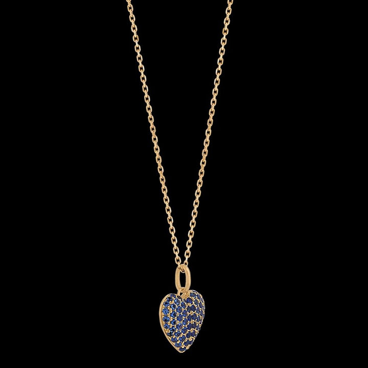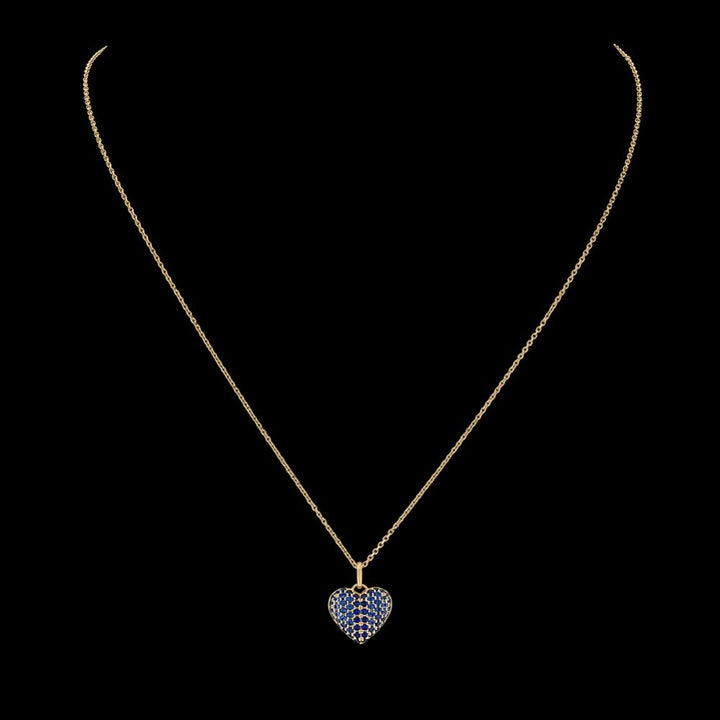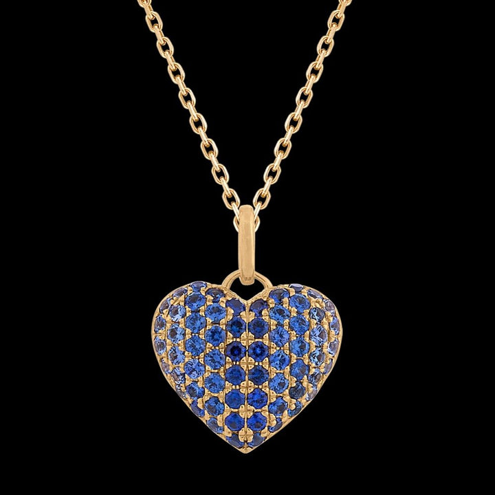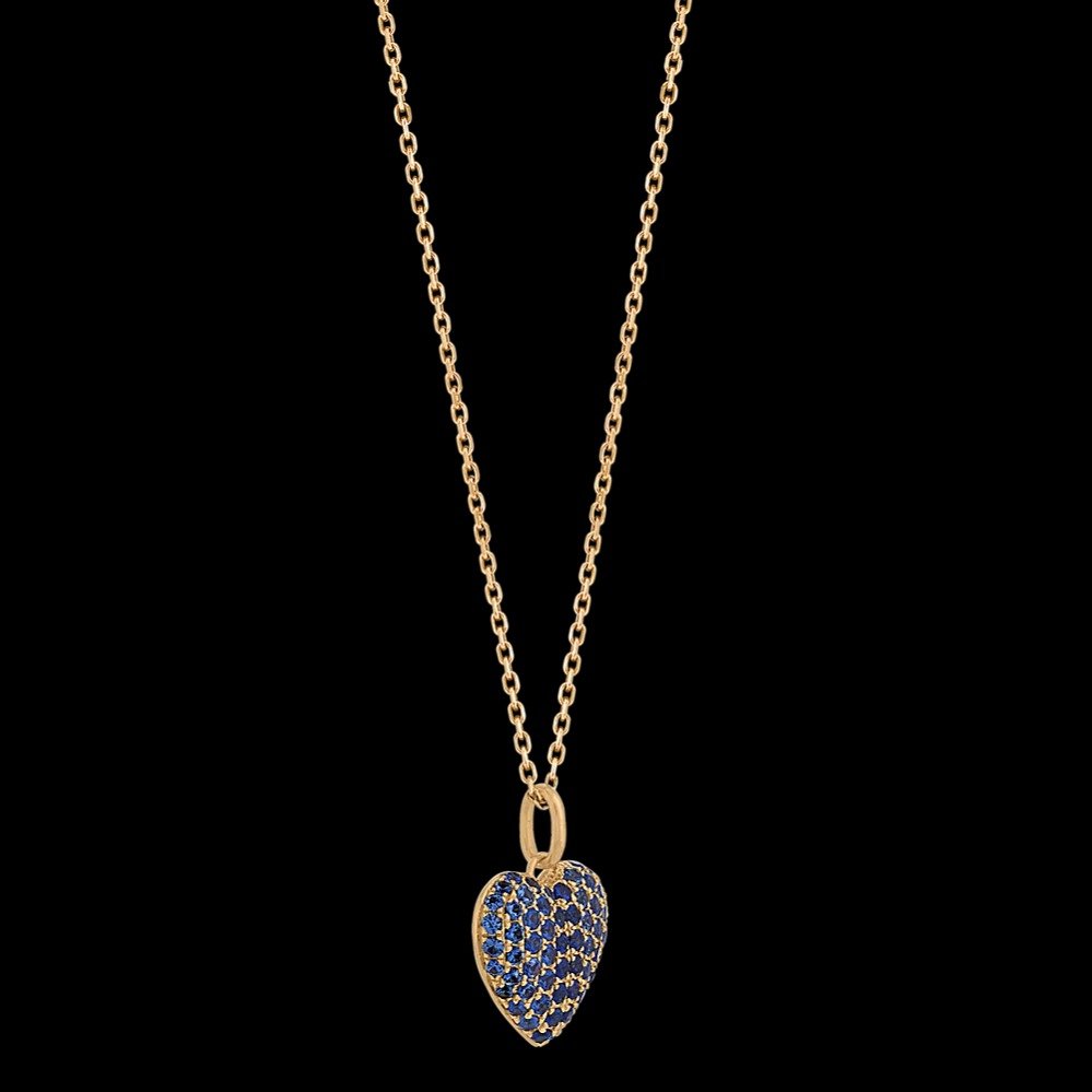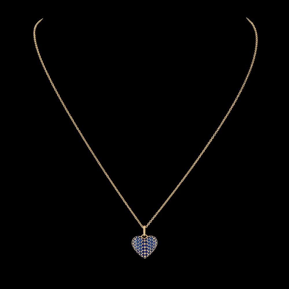 Since 1929, the Shane family have expertly crafted fine jewelry for life's most special moments. Tom Shane and his son, Rordan, uphold the legacy of being your friend in the jewelry business. The one you can trust to help you shine brighter every day. Rooted in quality craftsmanship and a fervent pursuit of the most beautiful gemstones, Shane Co. ensures your love story is in good hands. They are here for you for a lifetime, because they are in it for a lifetime. Let Shane Co. help you find jewelry that feels like you.Style notes: This beautiful heart-shaped pendant features sixty-two round blue natural sapphires at approximately .95 carat total gem weight that are set into quality 14 karat yellow gold. This ombre piece hangs from a matching 18-inch diamond cut cable chain and is secured with a lobster clasp.Price: Please note price may vary due to exchange rate differences or shipping, duties and taxes. Price may also vary with materials choice. Final price is calculated at checkout at the designer's website. Materials: 14k yellow gold with .95ctw blue sapphires. Dimensions: 18-inch diamond cut cable chain