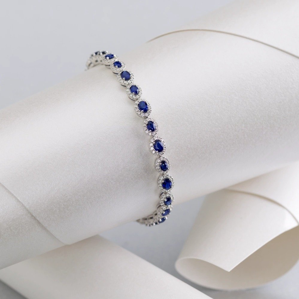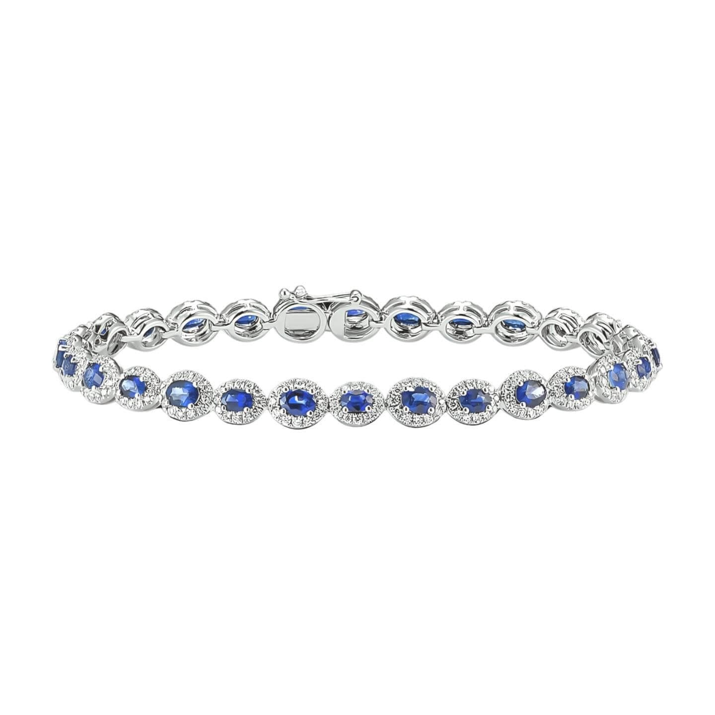 Since 1929, the Shane family have expertly crafted fine jewelry for life's most special moments. Tom Shane and his son, Rordan, uphold the legacy of being your friend in the jewelry business. The one you can trust to help you shine brighter every day. Rooted in quality craftsmanship and a fervent pursuit of the most beautiful gemstones, Shane Co. ensures your love story is in good hands. They are here for you for a lifetime, because they are in it for a lifetime. Let Shane Co. help you find jewelry that feels like you.Style notes: Each traditional blue natural sapphire in this gorgeous bracelet has its own halo of natural diamonds for a beautiful combination of color and sparkle. It’s crafted in bright 14-karat white gold with a secure box clasp and figure-eight safety latch.Price: Please note price may vary due to exchange rate differences or shipping, duties and taxes. Price may also vary with materials choice. Final price is calculated at checkout at the designer's website. Materials: 14k white gold with blue sapphire and 1.45ctw diamonds.Dimensions: 7-inch length