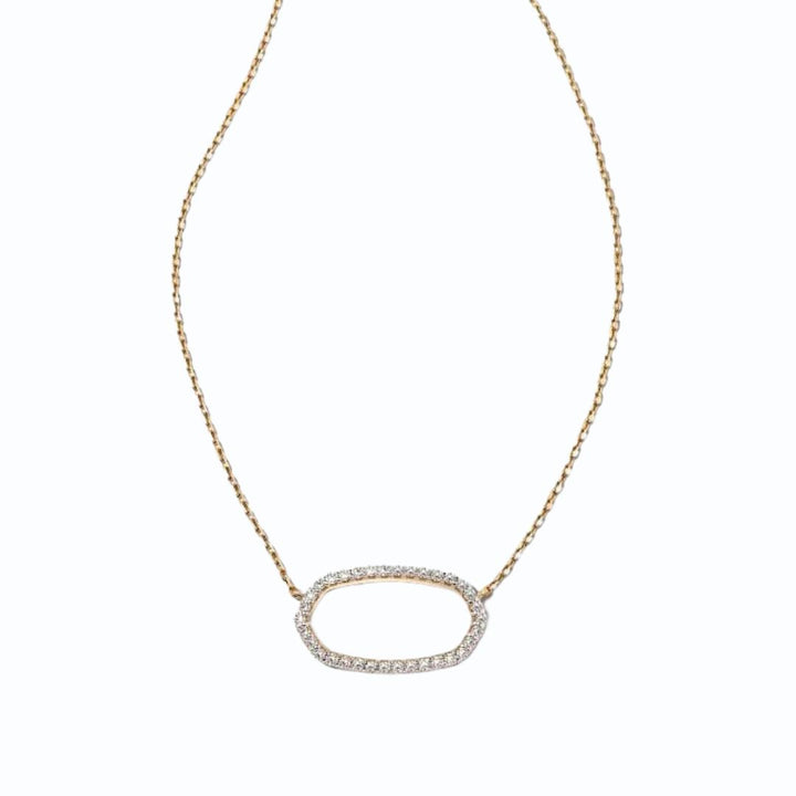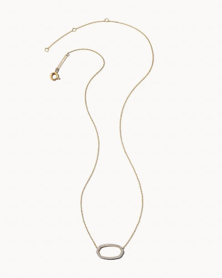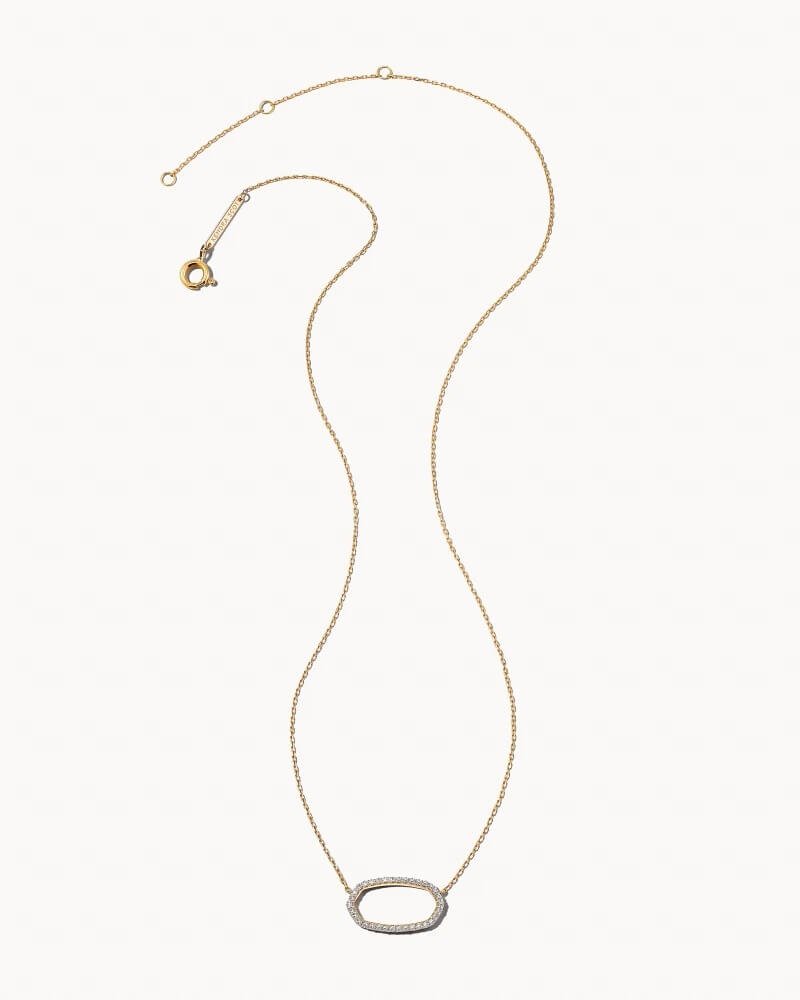 Kendra Scott is a renowned American designer and entrepreneur. Noticing she could never find affordable colored gemstone jewelry, Kendra set out to fill the gap in the market in 2002. With only $500, she began creating jewelry from her bedroom in Austin, Texas. It grew to an empire and today the Kendra Scott brand is celebrated globally for its distinctive designs, vibrant colors, and commitment to philanthropy.Style notes: Kendra's icon in diamonds ��� is there anything more striking? With an open frame that's fresh yet still classic, we designed this pendant to be as universally beloved as the original, matching every look and taste perfectly.' - Kendra. Timeless, signature, and versatile, it's the Elisa 14k Yellow Gold Open Frame Pendant Necklace in White Diamond. Defined by the outline of our iconic shape dressed in hand selected and placed diamonds, this heirloom design will make a statement for generations.Price: Please note price may vary due to exchange rate differences or shipping, duties and taxes. Price may also vary with materials choice. Final price is calculated at checkout at the designer's website. Materials: 14k yellow gold with 0.17ctw white diamonds, quality H, SIDimensions: Size- 16'L chain with a 2' extender, 0.67'L x 0.34'W pendant
