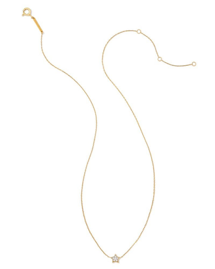 Kendra Scott is a renowned American designer and entrepreneur. Noticing she could never find affordable colored gemstone jewelry, Kendra set out to fill the gap in the market in 2002. With only $500, she began creating jewelry from her bedroom in Austin, Texas. It grew to an empire and today the Kendra Scott brand is celebrated globally for its distinctive designs, vibrant colors, and commitment to philanthropy.Style notes: A stellar addition to any necklace stack, the Tiny Star 14k Yellow Gold Pendant in White Diamond will bring an eye-catching twinkle to any occasion. Crafted with quality materials designed for long-lasting wear, this petite necklace is truly a style written in the stars.Price: Please note price may vary due to exchange rate differences or shipping, duties and taxes. Price may also vary with materials choice. Final price is calculated at checkout at the designer's website. Materials: 14k yellow gold with 0.05ctw white diamonds, quality H, SIDimensions: Size- 16' chain, 2' extender, 0.276' x 0.273' without bail