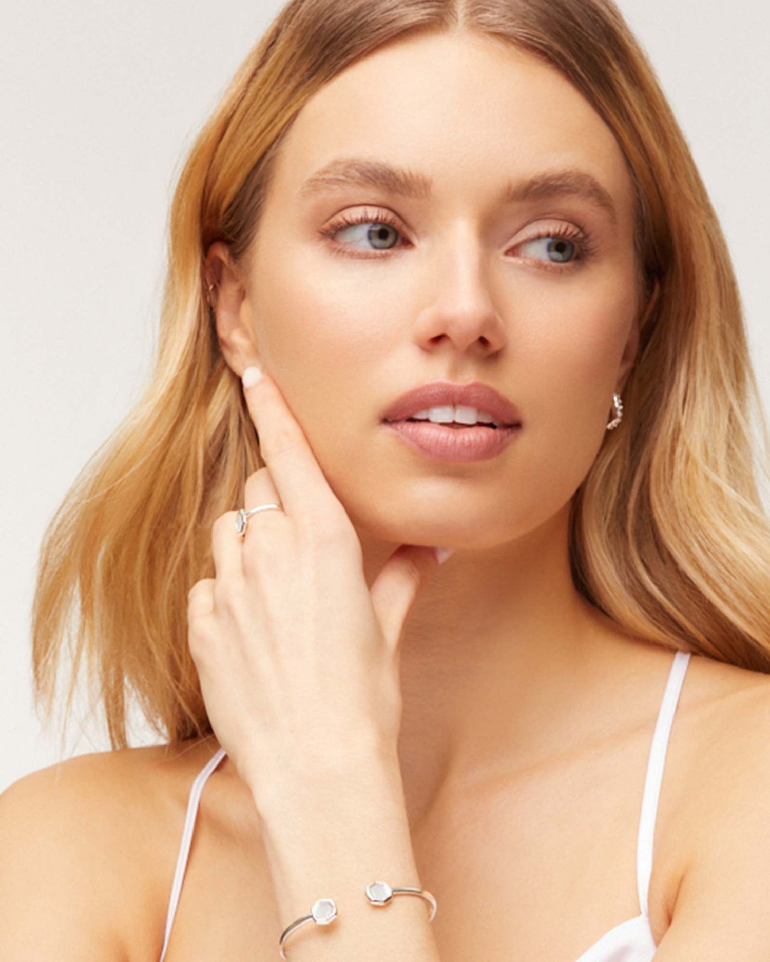 A minimalist pinch cuff bookended with our signature shell-inlaid shape, the Davis Sterling Silver Small Cuff Bracelet in Ivory Mother-of-Pearl is a stacking staple. No matter the size of your wrist, its sure to fit you and your one-of-a-kind style.