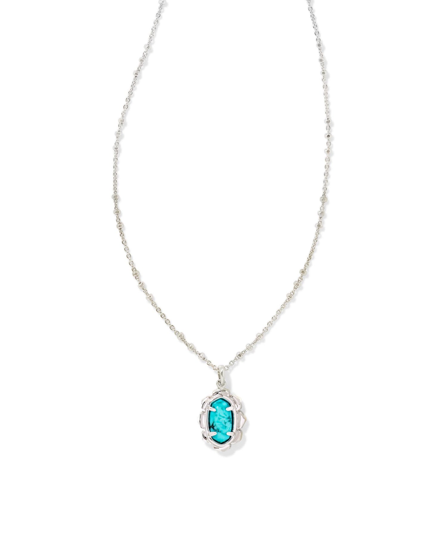The newest take on our iconic silhouette, crafted with subtle, metallic petals and a modern, accented chain. Whether you wear it solo or layer up, the Piper Silver Pendant Necklace in Variegated Turquoise Magnesite is a fresh addition to your everyday favorites.