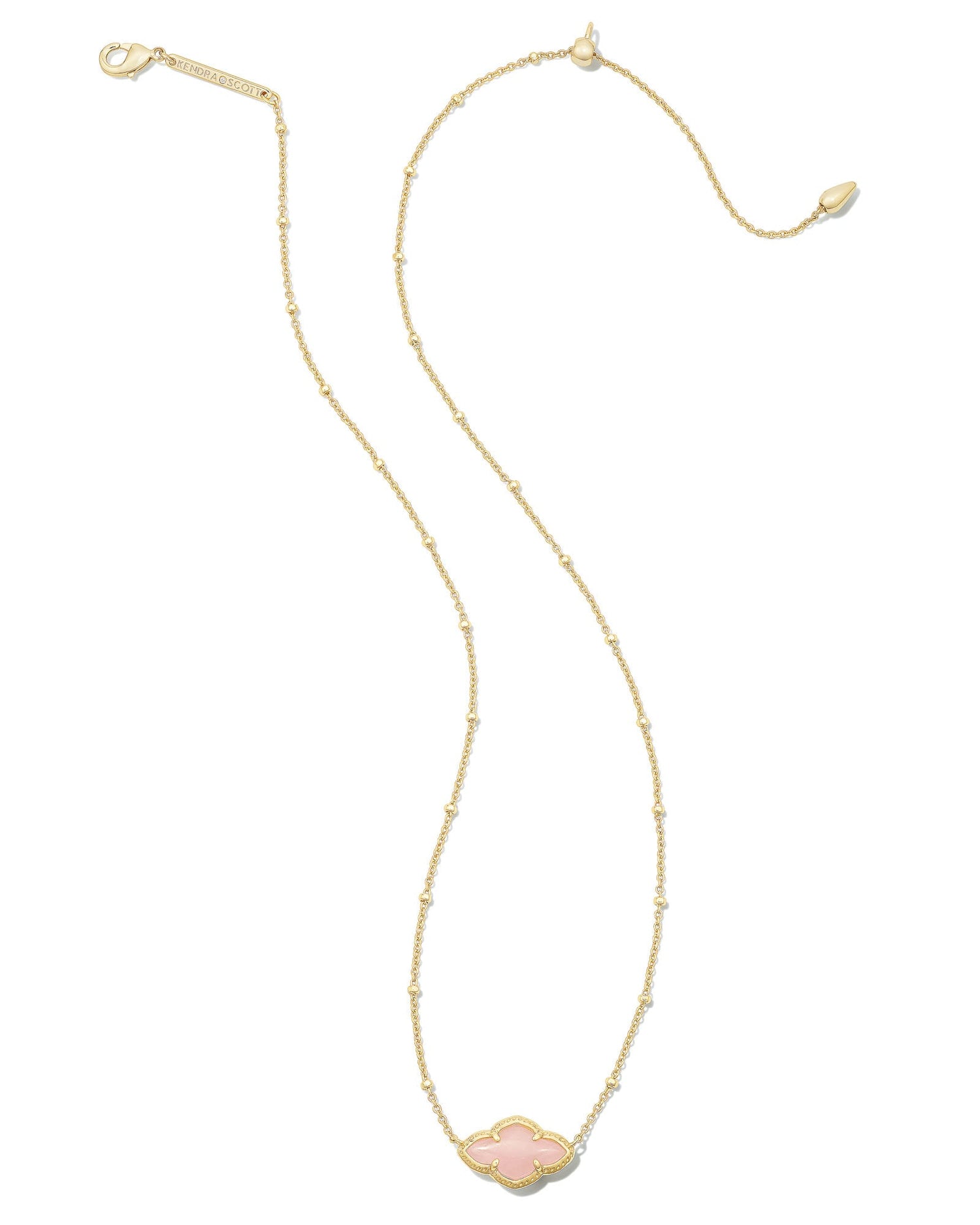 An homage to our iconic medallionrepresenting joy, optimism, possibility, and femininitymeet the Abbie Gold Pendant Necklace in Rose Quartz featuring an elegant, elongated silhouette.