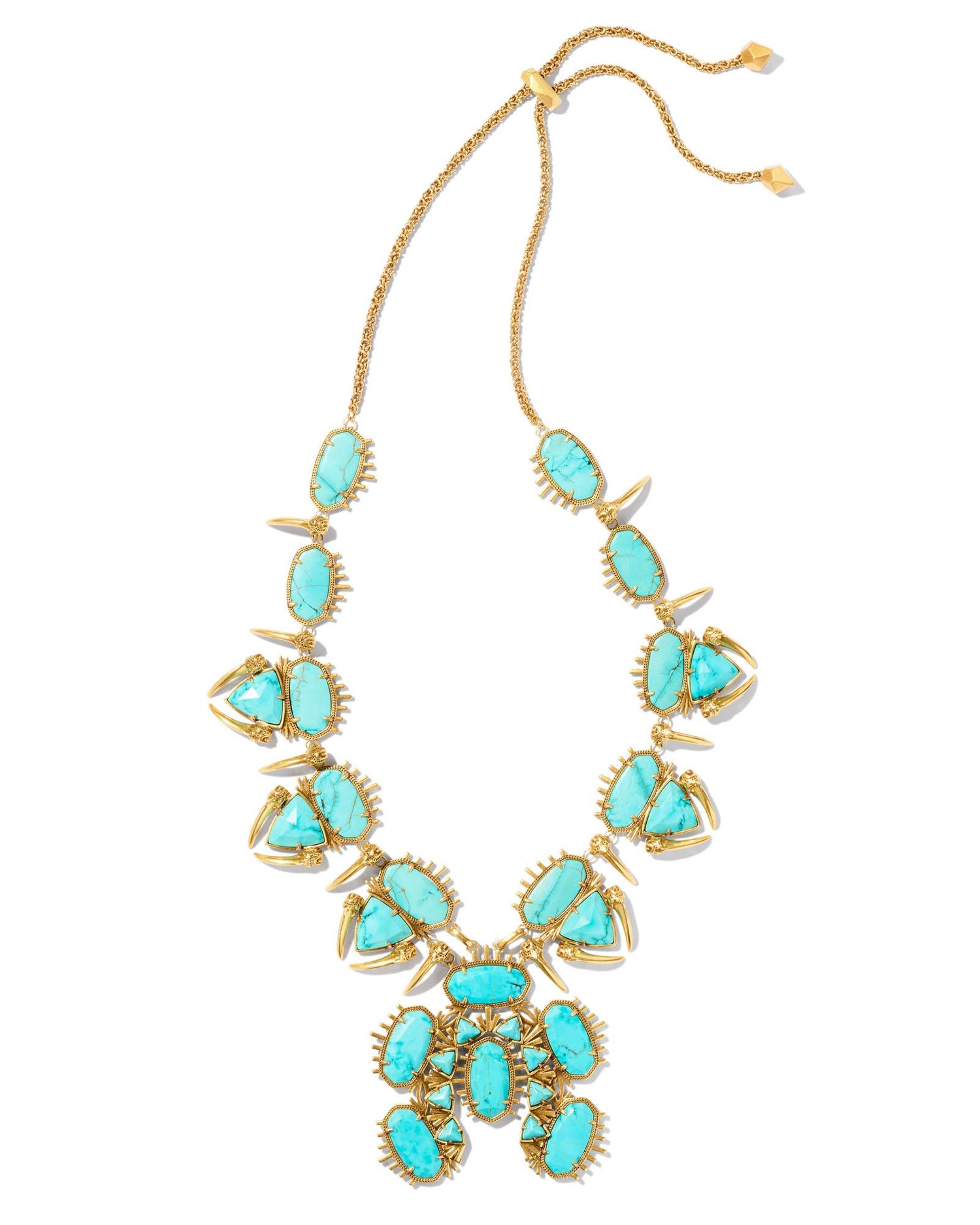 The Odessa Vintage Gold Statement Necklace in Variegated Turquoise Magnesite is here to let you have your cowgirl moment. A celebration of the bold designs of the West, this statement style combines vintage-inspired metal and gorgeous stone in an artfully crafted necklace.
