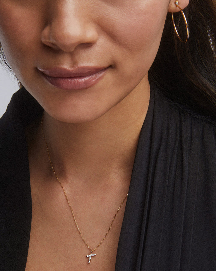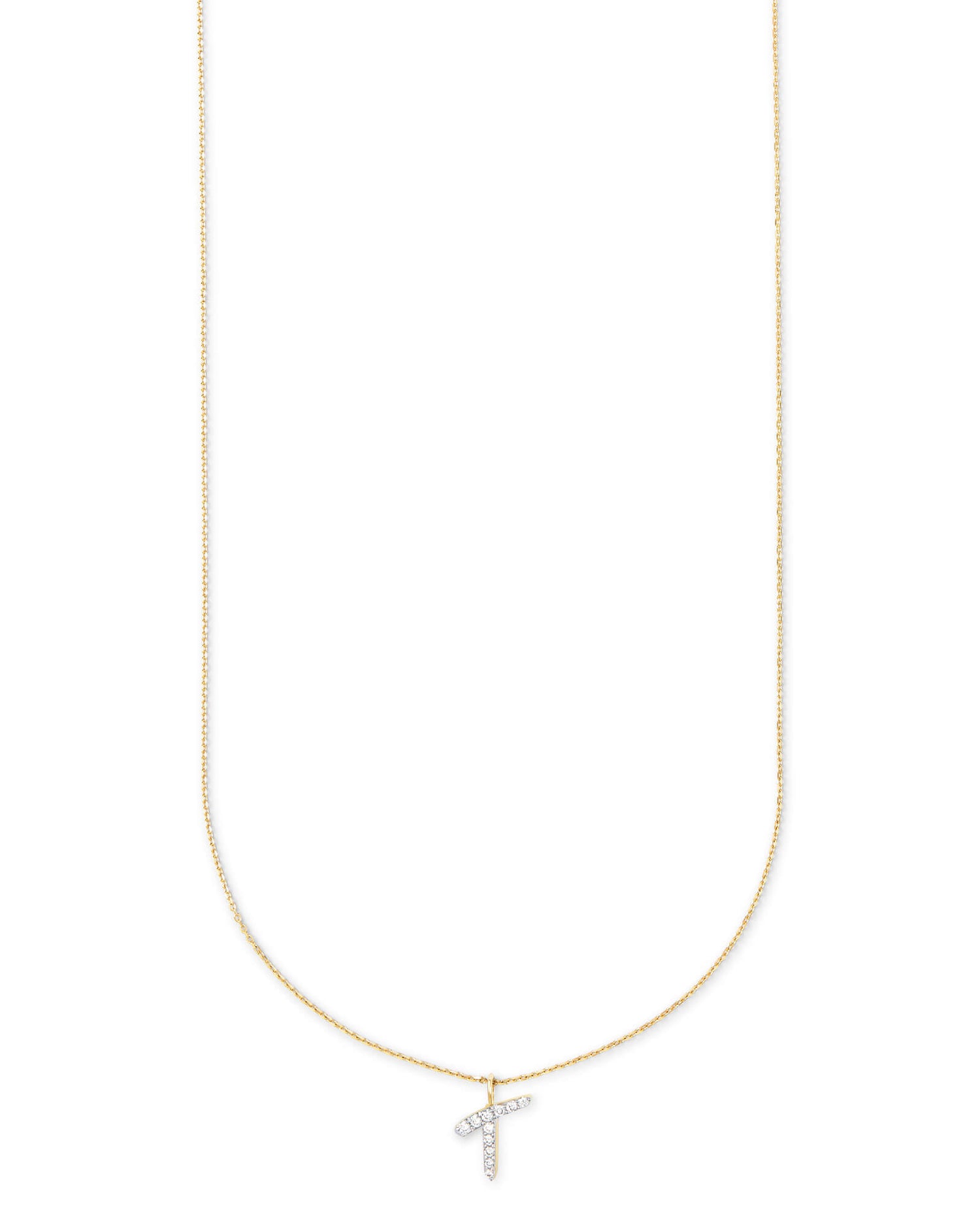 The Diamond Letter T Pendant Necklace in 14k Yellow Gold is a striking example of sentimental style. Beautifully timeless and personal to each wearer, the Diamond Letter T Pendant Necklace was designed to be treasured for a lifetime. To create these pendant necklaces, each letter is hand drawn in our Austin design studio, then layered with pave diamonds for breathtaking sparkle. Shop the Diamond Letter Pendant Necklace CollectionOur diamonds are conflict-free in compliance with the Kimberley Process. 14k Yellow Gold Size: 0.48"L x 0.34"W pendant, 15" chain with 3" extender 0.082 total carat weight Material: Round Brilliant White Diamonds Diamond Quality: H, SI1 Please note: Due to the one-of-a-kind nature of the medium, exact color patterns may vary slightly from the image shown.