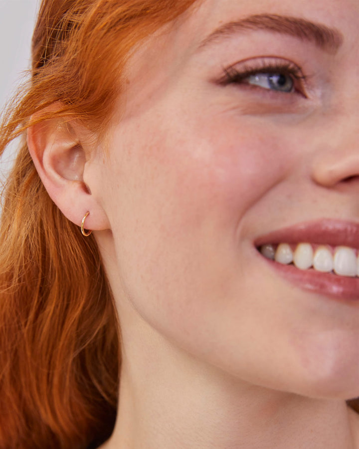 A go-to pair you never have to take off. Crafted with solid 14k Gold, the Gina Seamless Huggie Earrings in 14k Yellow Gold are the most classic of huggie styles, designed to last a lifetime of wear. To wear, insert the blunt side of the earring loop through your piercing and lock it into the pointed end of the snap post closure.