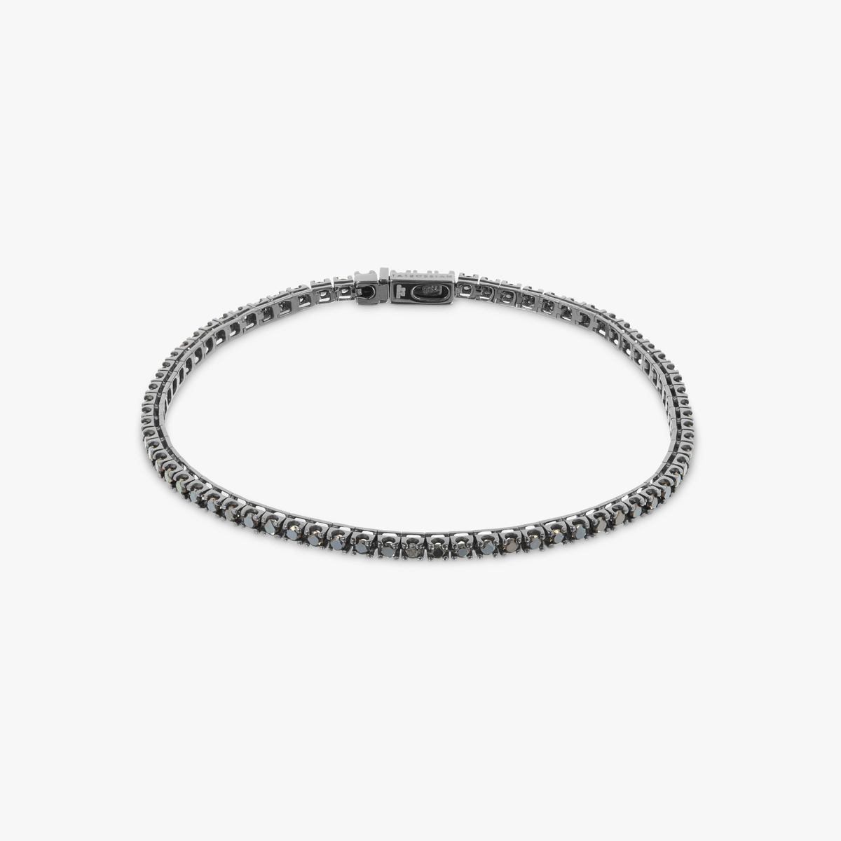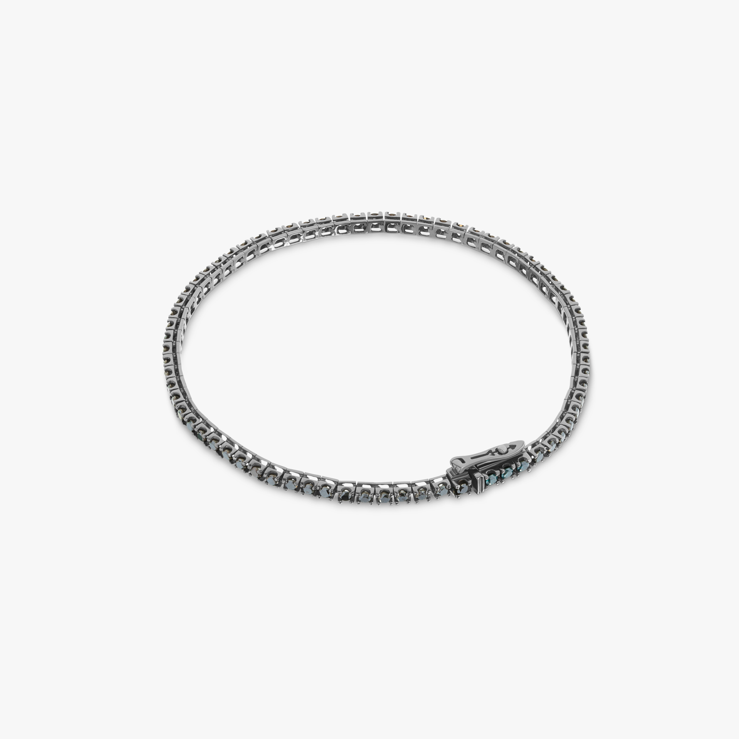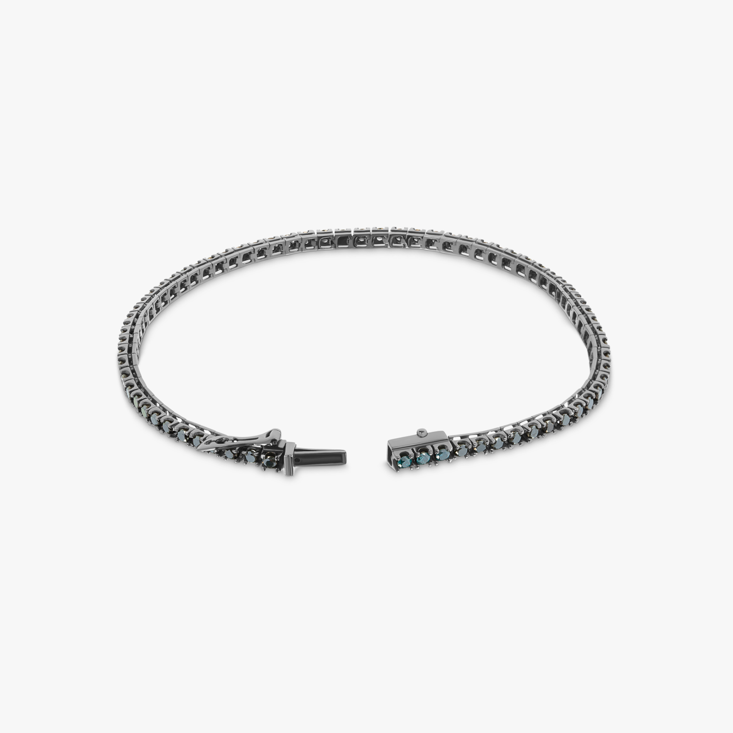 The Tennis Bracelet in Black Rhodium Plated 18K White Gold by Tateossian exemplifies timeless elegance with a modern twist. It features 68 black diamonds (1.99cts) and 3 blue diamonds (0.09cts) set meticulously in a pavé style along a single strand. The black rhodium plating adds depth and durability, enhancing the bracelet’s luminous surface and making it a striking accessory for any occasion. Designed for those who appreciate subtle luxury, this bracelet offers a captivating blend of sparkle and sophisticated design.