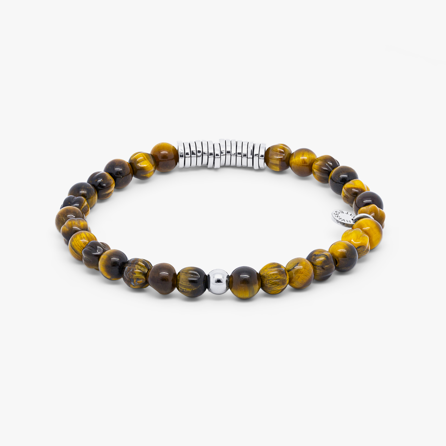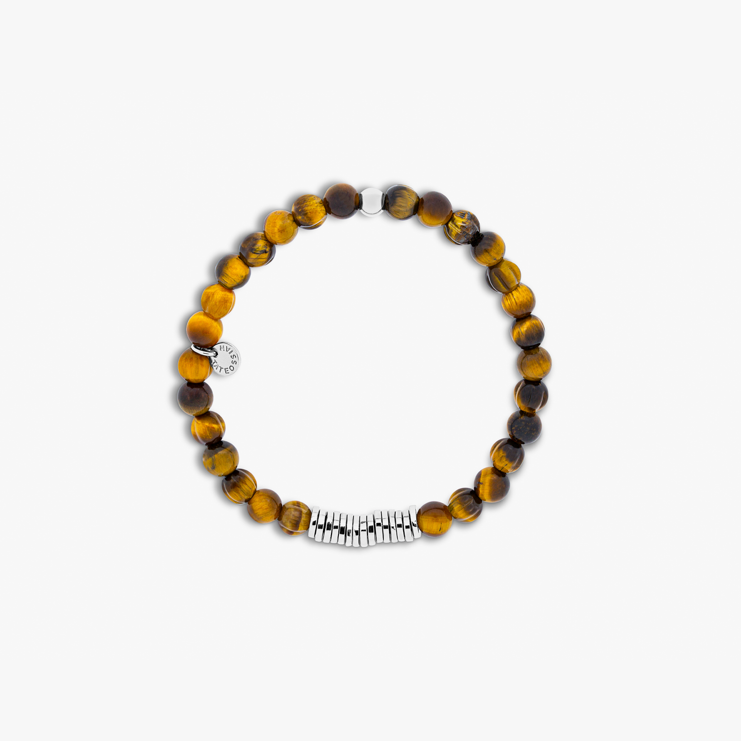 Composed of natural tiger eye beads and hand-polished rhodium-plated sterling silver discs. Strung on closed elastic for easy and comfortable wear. Each bead naturally unique.