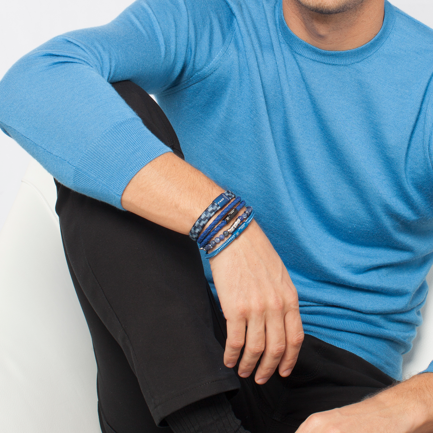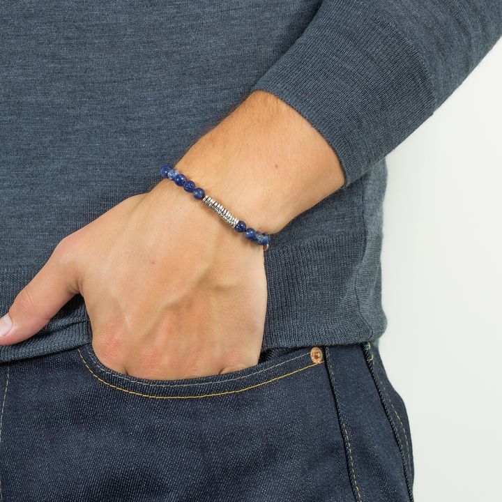 Crafted with natural blue sodalite beads and hand-polished rhodium-plated sterling silver discs. Strung on durable closed elastic for easy wear and flexible fit. Each bead’s natural variation ensures uniqueness.