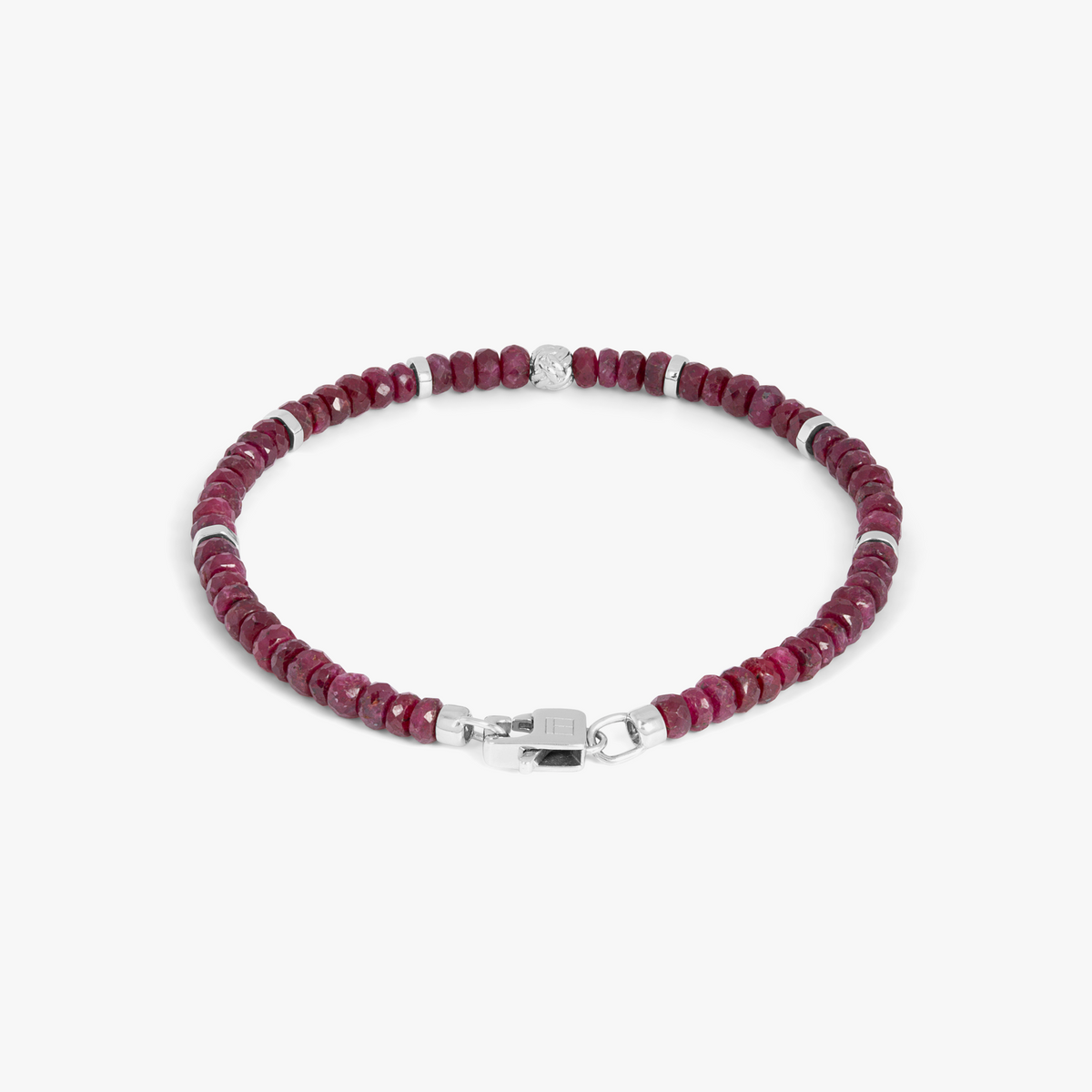This Nodo Beaded Bracelet by Tateossian is a unisex piece showcasing faceted ruby beads paired with rhodium-plated sterling silver discs. Each ruby’s natural variation ensures every bracelet is one of a kind. Finished with a lobster clasp, the bracelet balances artisanal craftsmanship with vibrant color, making it an elegant, versatile wrist adornment.