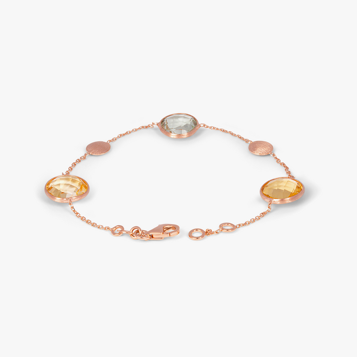 Handcrafted in 14K satin rose gold with faceted citrine and prasiolite gemstones. Adjustable length 16-17 cm with secure clasp.