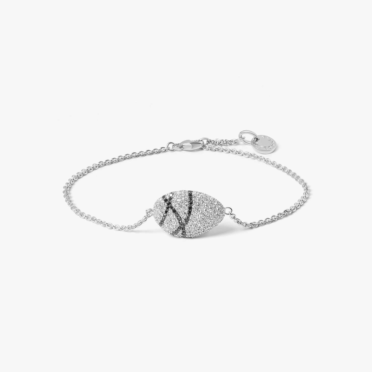 The Pebble Bracelet in Sterling Silver by Tateossian is an artful display of contrast and movement, formed in an irregular pebble shape and covered in a pavé setting of white and black diamonds. The crossover diamond pattern adds fluidity to the piece, making it both modern and organic. Designed on an adjustable trace chain with a lobster clasp, it offers versatile wear and a refined silhouette. This bracelet symbolizes harmony through the interplay of light and dark, perfect for those seeking a contemporary yet meaningful accessory.