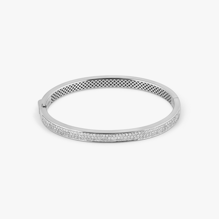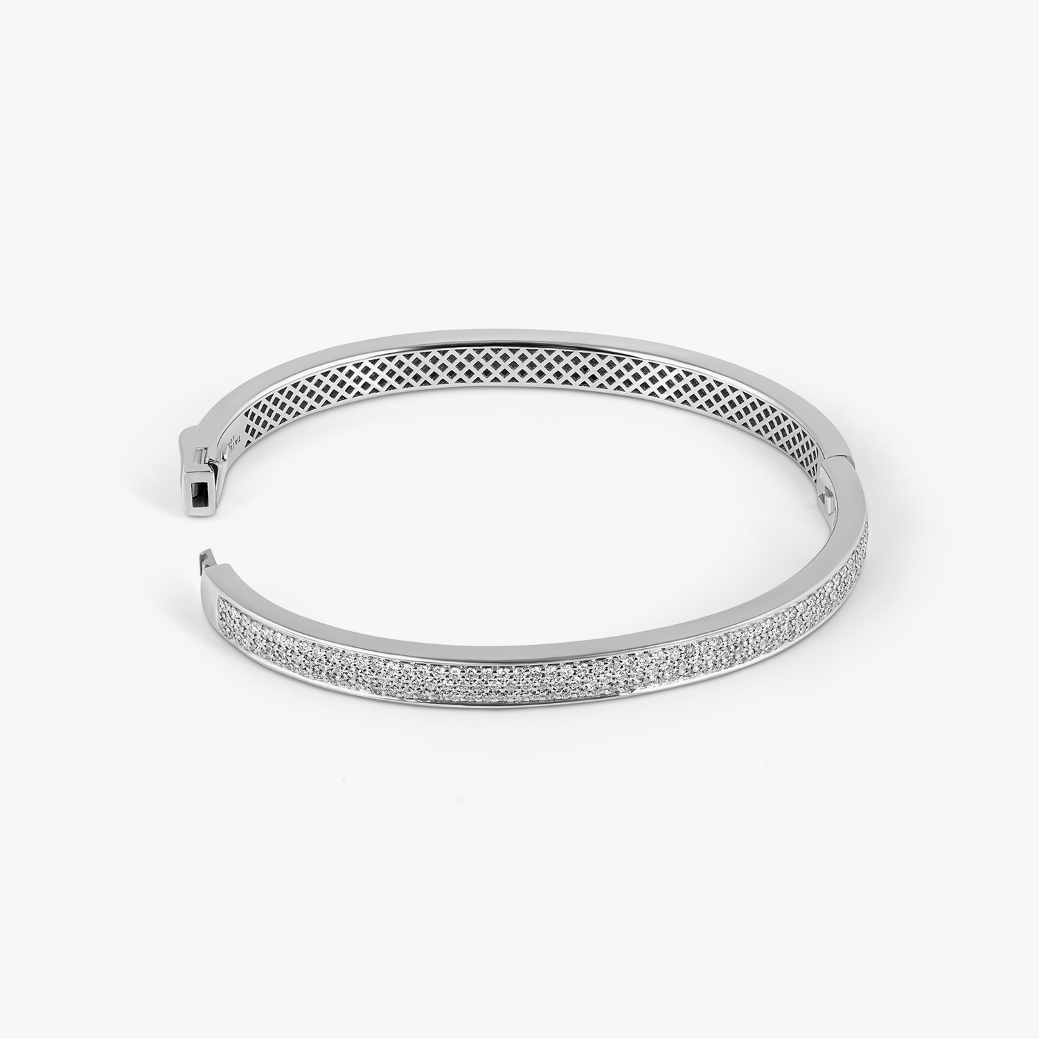 Rhodium-plated sterling silver with 173 pavé-set white diamonds, totaling 1.242 carats. Oval shape with hinged design, button clasp with latch for secure fit. Dimensions tailored for comfortable wrist wear.