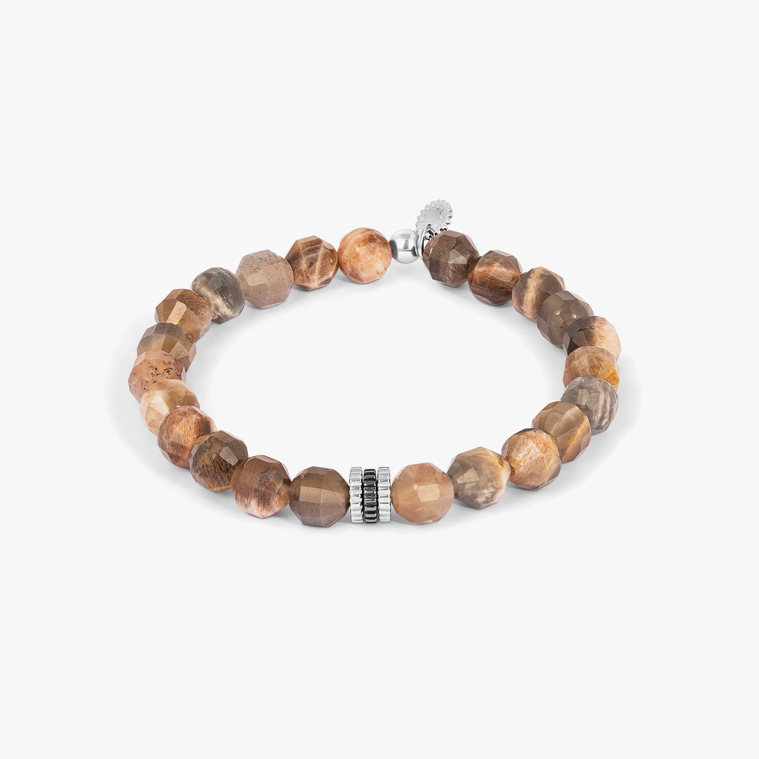 Gear Trio Hexade Beaded Bracelet in Rhodium Silver with Black Moonstone