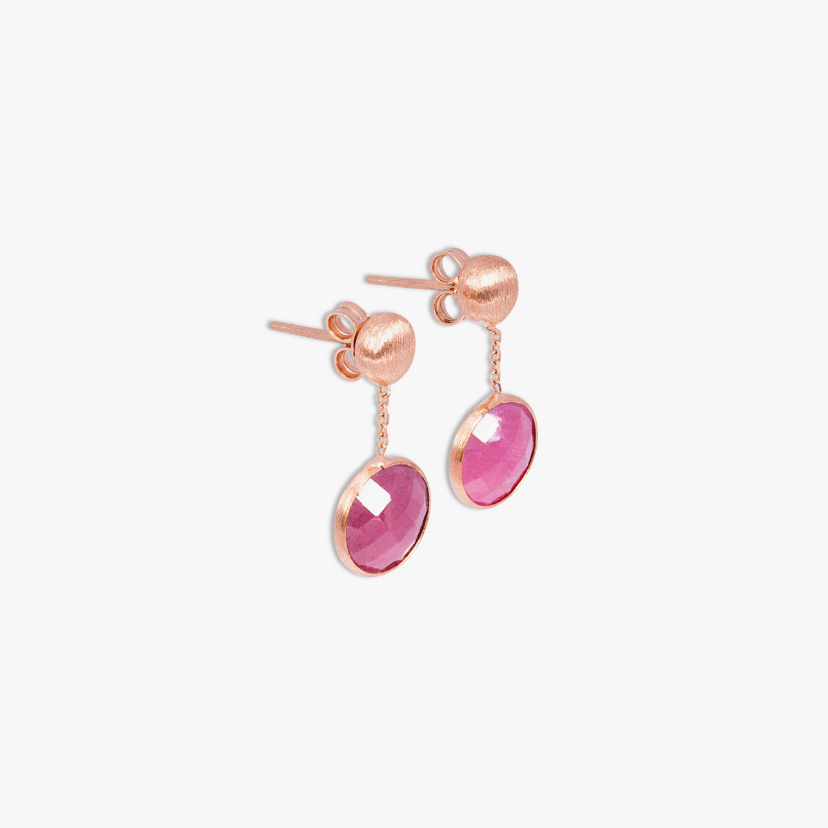 Crafted from 14K satin rose gold with bezel-set faceted ruby root stones. Satin finish with classic drop earring design. Meticulous artisan detail.