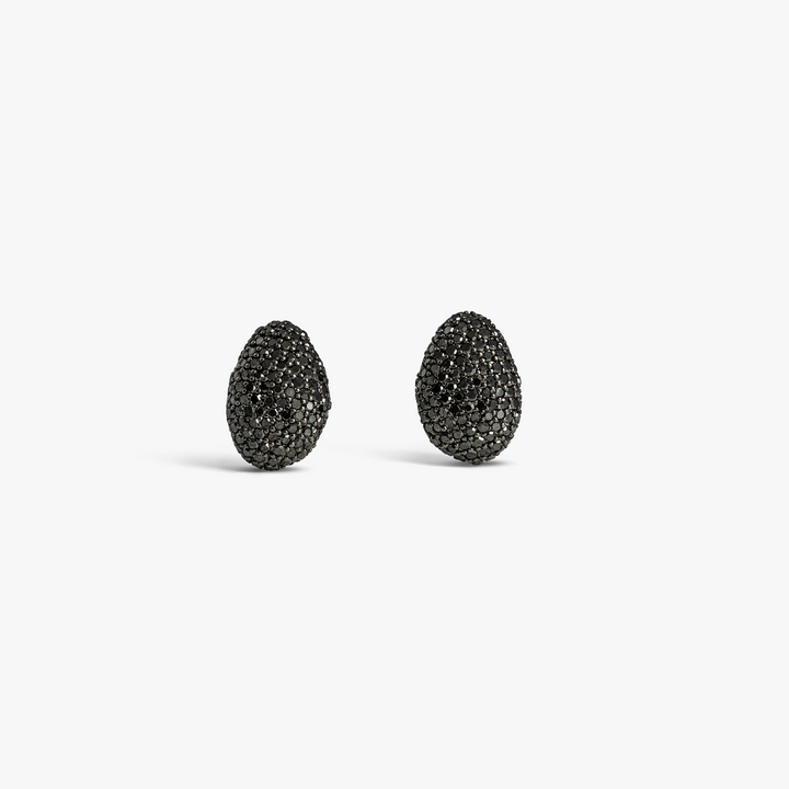 These Sterling Silver Pebble Black Diamond Stud Earrings by Tateossian are a study in organic luxury. Crafted in an irregular pebble shape and encrusted with 224 single-cut black diamonds totaling 0.70 carats, they deliver a mesmerizing sparkle with a subtle dark allure. The minimalist sterling silver setting highlights the natural beauty of the stones, creating an effortlessly chic and bold accessory.