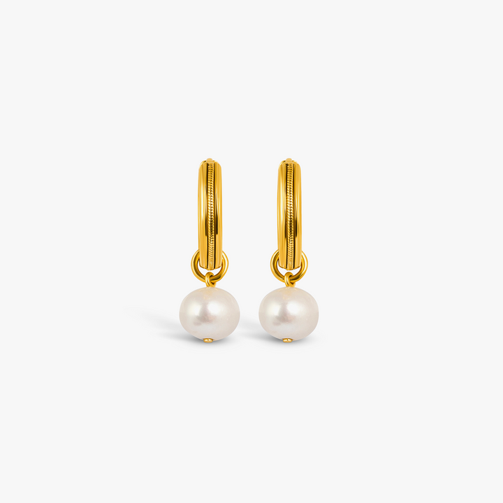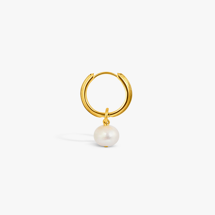 Made from sterling silver with 2-micron yellow gold plating. Hoop earrings with snake chain detailing and removable white pearl charm. Secure fastening.