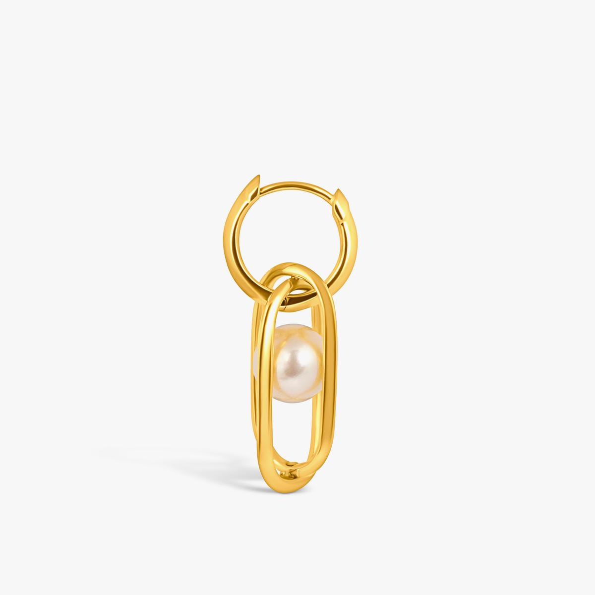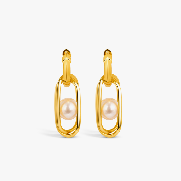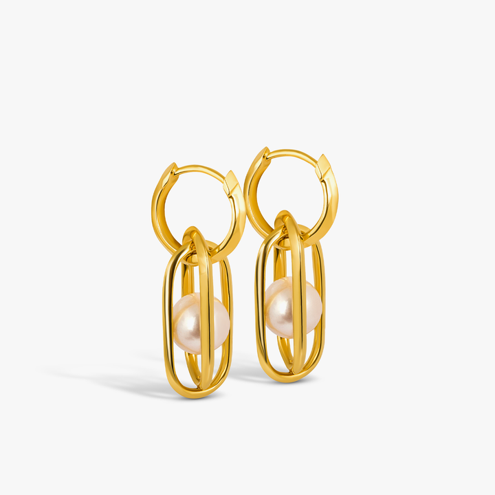 Sterling silver base with 2-micron 18K yellow gold plating. Hoop design with cage made from square wire holding white pearl. Secure hook closure.