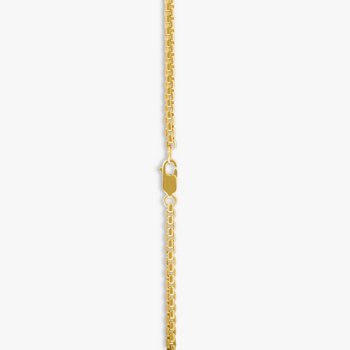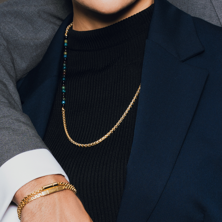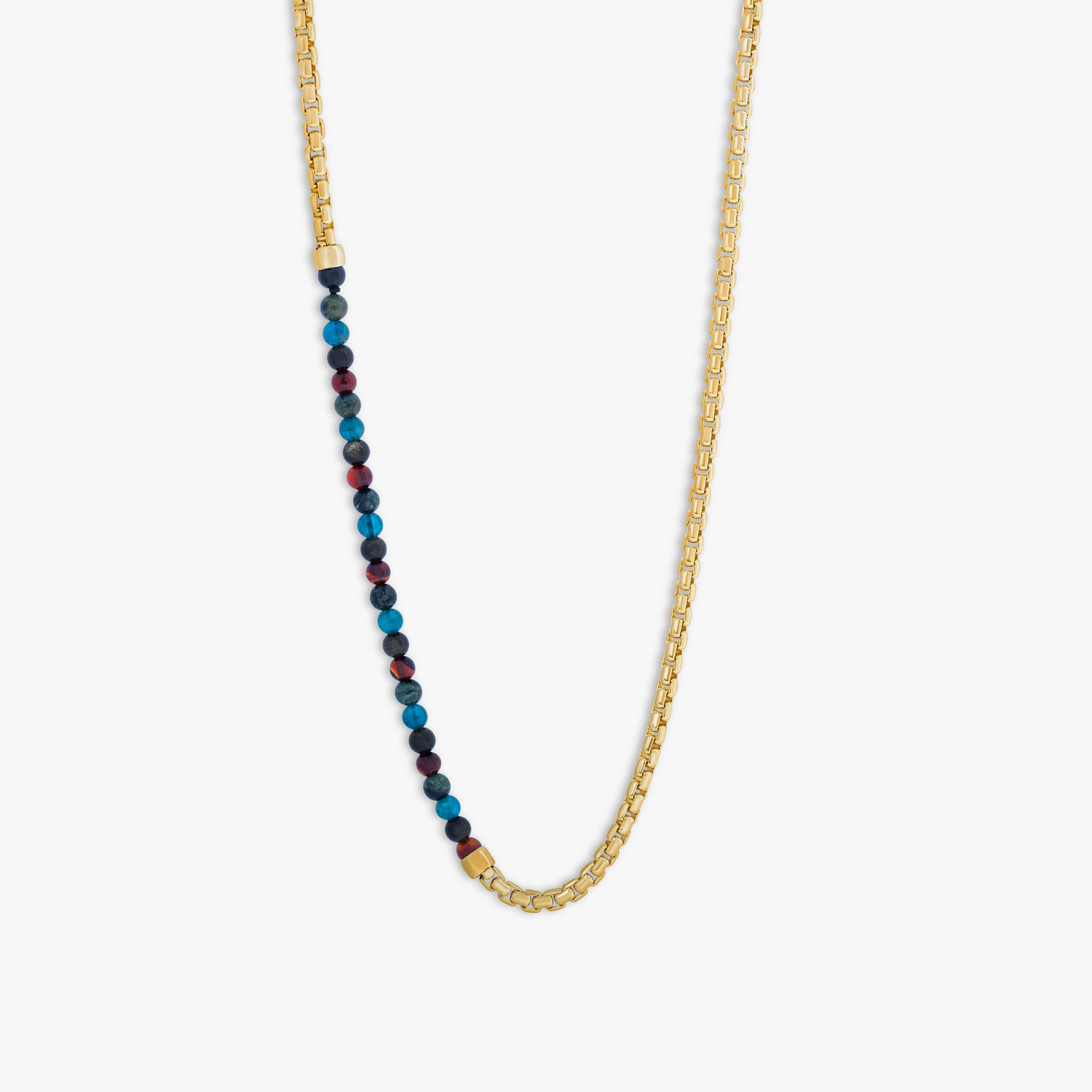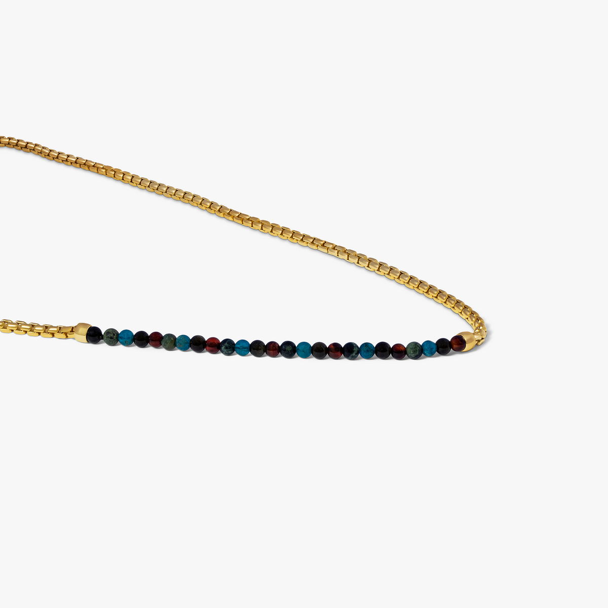 Made from 2-micron yellow gold-plated sterling silver. Features multicoloured sennit beads (gold obsidian, apatite, Kambala jasper, red agate), 4mm rounded box chain, 23-inch length, and square lobster clasp.