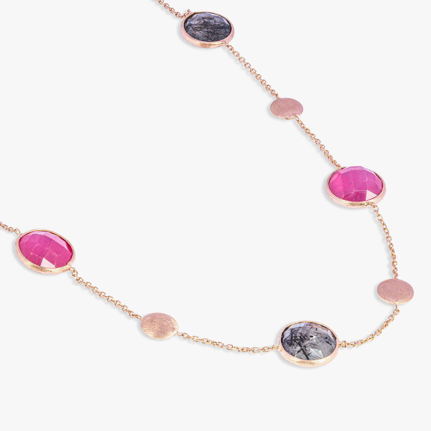 Handcrafted in 14K satin rose gold with faceted black rutilated quartz and ruby root gemstones. Chain length adjustable from 40.5 to 43 cm, secured with a clasp.