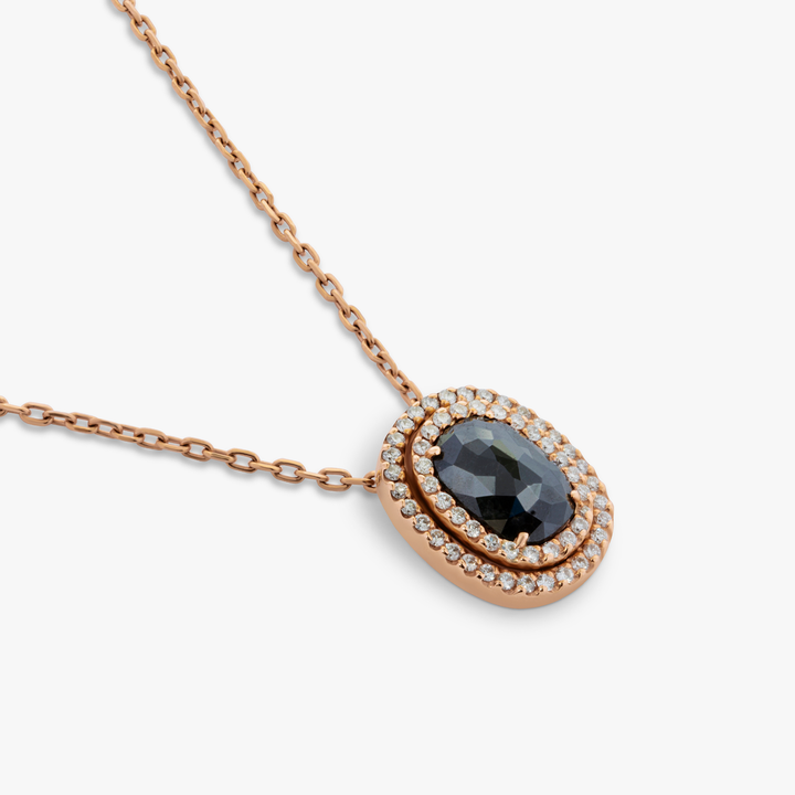 Style Notes: The Black Diamond Pendant with White Diamonds in 18K Rose Gold by Tateossian is a stunning showcase of contrast and sparkle. Centered on a rose-cut midnight black diamond (approx. 1.945 carats), the pendant is framed by two rows of 56 meticulously set single-cut white diamonds (total approx. 0.38 carats, G/H color, VVS1 clarity). Finished with an adjustable length lobster clasp, this piece captures light brilliantly and commands attention with its bold elegance.
