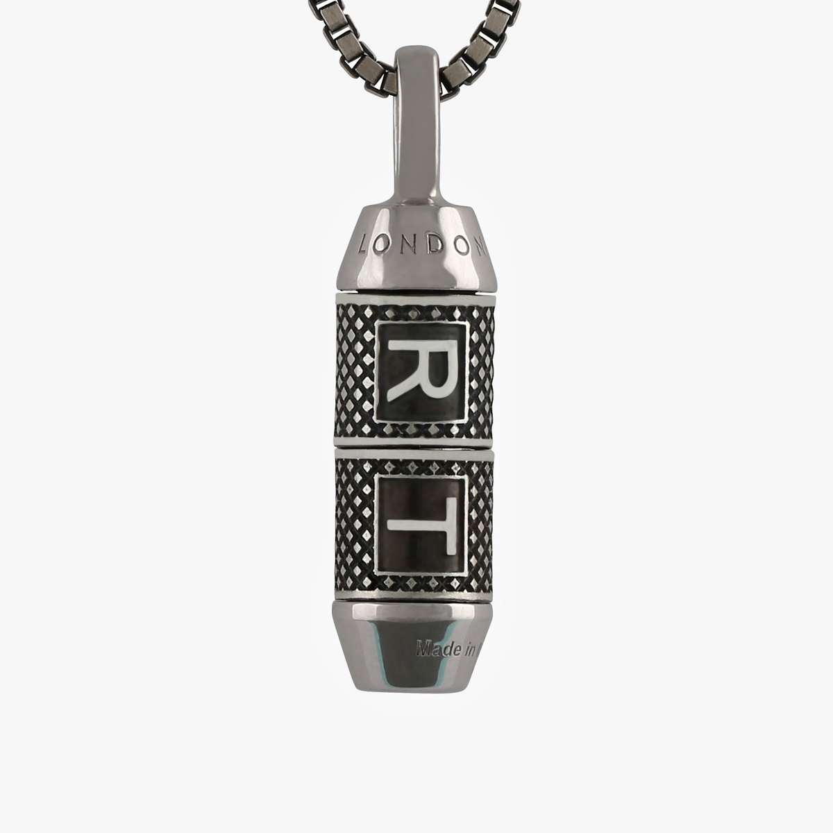 Crafted from rhodium and black rhodium plated sterling silver. Features a pendant designed for interchangeable initial discs (sold separately). Contemporary duo-tone finish.