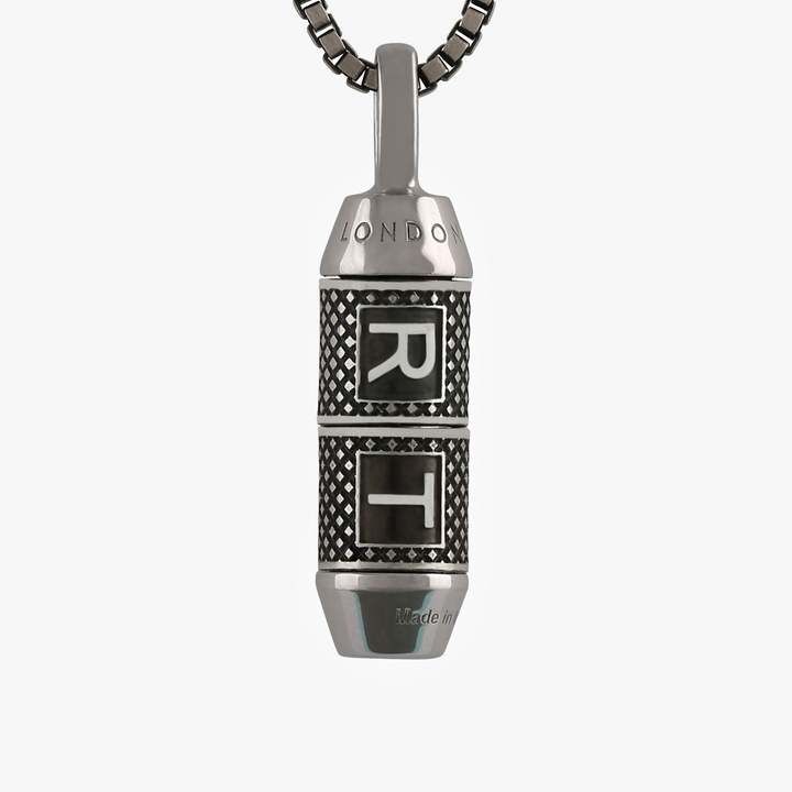The Lucky Me Necklace by Tateossian offers personalized style with a sleek, modern silhouette. Crafted from rhodium and black rhodium plated sterling silver, this necklace features an interchangeable disc system to coordinate with the Lucky Me collection’s bracelets, cufflinks, and keyrings. Its contemporary duo-tone plating lends a masculine edge, ideal for everyday wear or gifting. Please note, the necklace is sold without initial discs, which are purchased separately to customize the look uniquely.