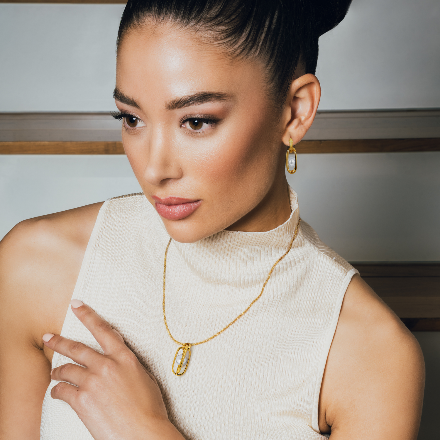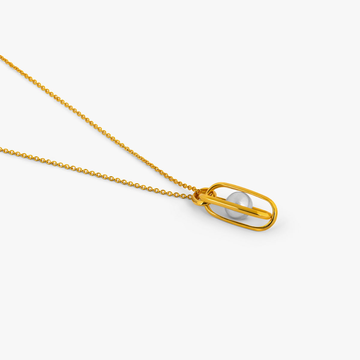 Sterling silver with 2-micron 18K yellow gold plating. Pendant formed by intersecting elongated ovals, encasing a white pearl. Adjustable trace chain.