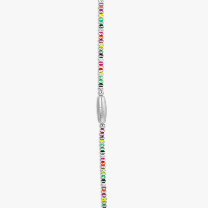 This Prism Necklace with Multicolour Galvanic Plated Silver Beads by Tateossian channels the vivid energy of the rainbow through multicoloured faceted beads combined with sterling silver. The 43 cm necklace is finished with a Tateossian-logo button clasp, offering a perfect balance of color and craftsmanship. A striking piece for layering or making a bold statement with elegant vibrancy.