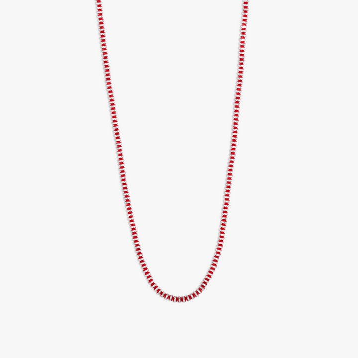 This Prism Necklace with Red Galvanic Plated Silver Beads by Tateossian radiates vibrant warmth through faceted red beads inspired by the vivid spectral shades of a rainbow. Paired with sterling silver and finished with a button clasp stamped with Tateossian’s logo, the 43 cm length offers versatile wear—perfect for layering or as a statement piece that adds a pop of color and personality to any ensemble.