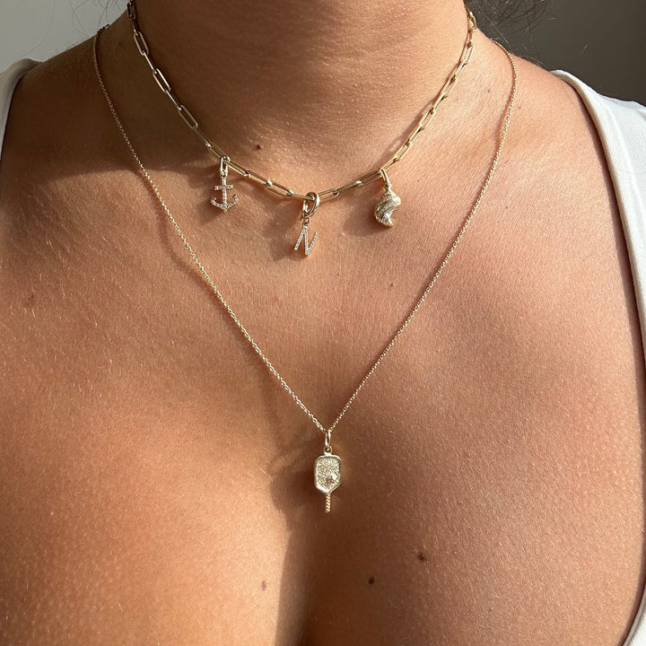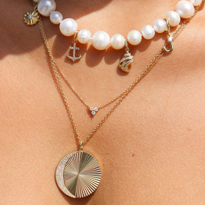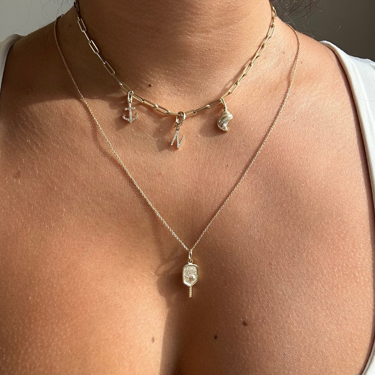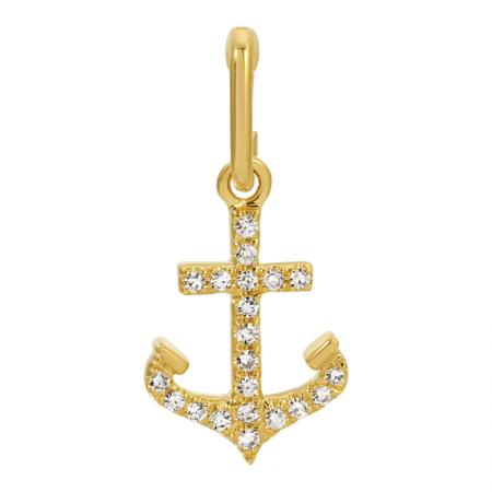 This Gold Anchor Diamond Charm by Monisha Melwani is a timeless symbol of strength and stability, crafted in luxurious 14KT yellow gold and accented with sparkling diamonds. The anchor design makes it a meaningful addition to any charm collection, perfect for wearing on a chain or adding to a bracelet for a personal touch.