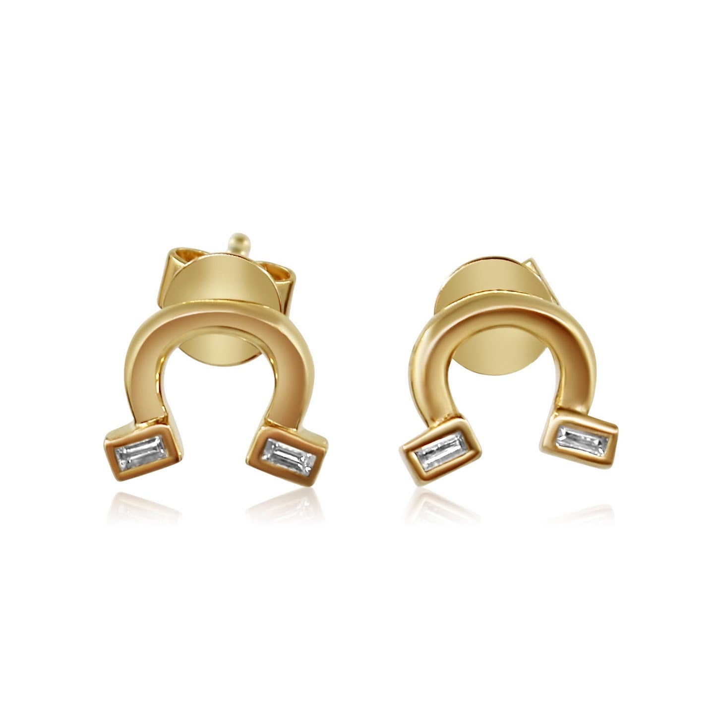 This Gold Baguette Diamond Horseshoe Earring by Monisha Melwani brings a touch of symbolic elegance to your collection. The horseshoe motif, known for its representation of luck and protection, is adorned with baguette diamonds, making it a perfect piece for everyday wear or layering with other earrings.