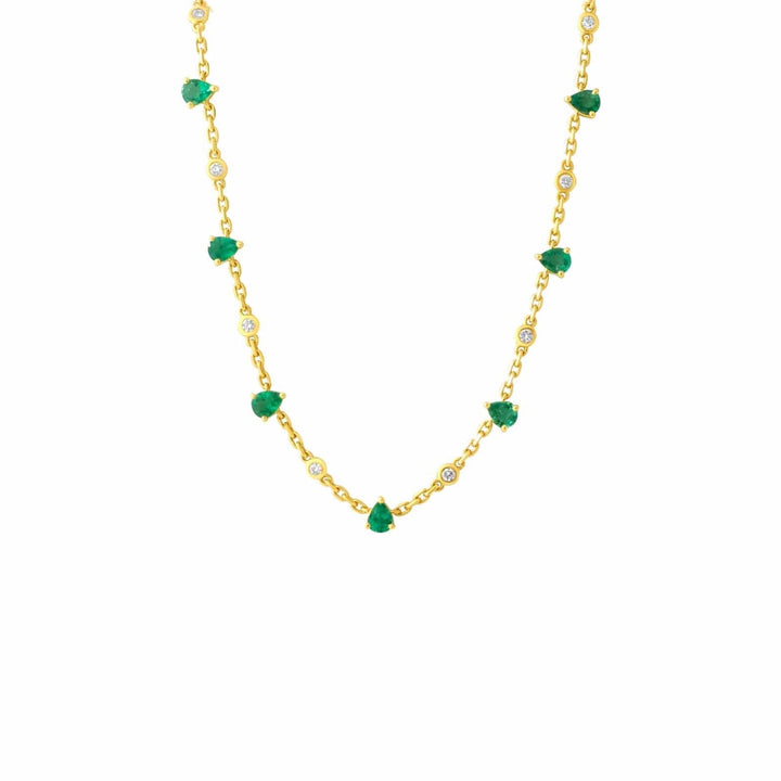 Handcrafted in 14KT yellow gold, featuring 1.83 carats of emeralds and 0.34 carats of diamonds. The necklace measures 13 inches + 3-inch extension for adjustability.