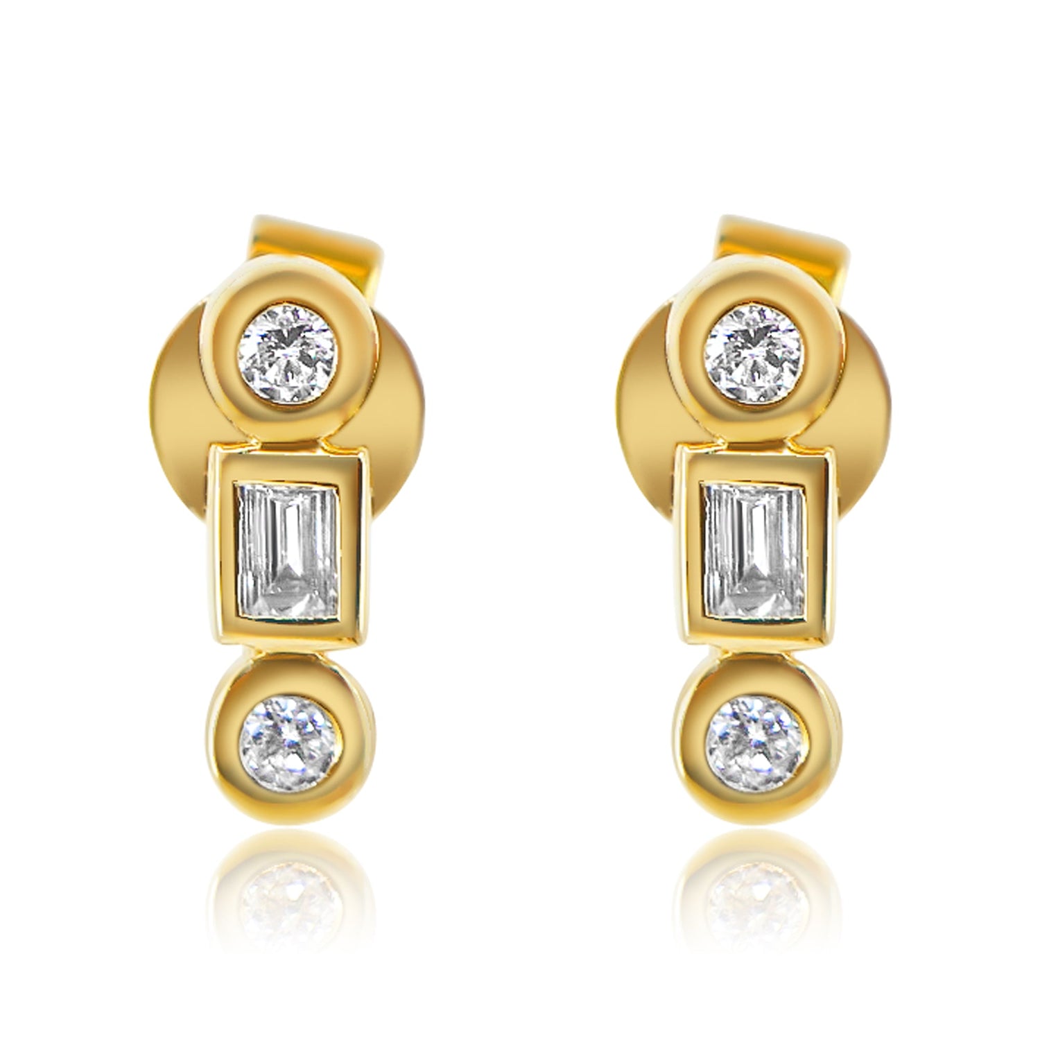 Gold Bezel Round Rectangle Diamond Line Stud Earring