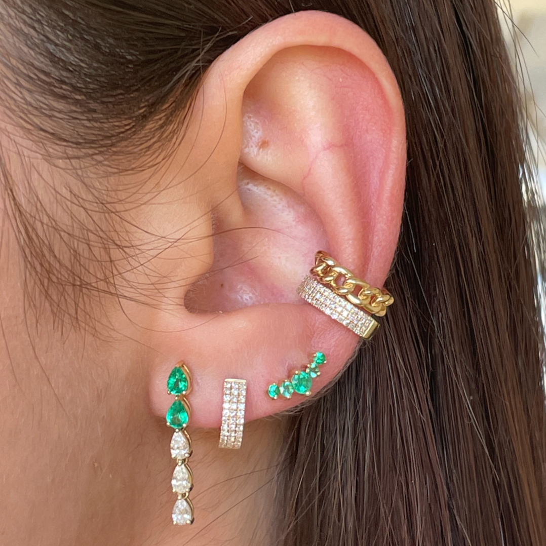 This Gold Cluster Emerald Graduated Climber Earring by Monisha Melwani brings a vibrant and luxurious touch to your jewelry collection. The graduated emeralds add a pop of color and elegance, making this climber earring perfect for special occasions or as a bold statement piece for everyday wear.