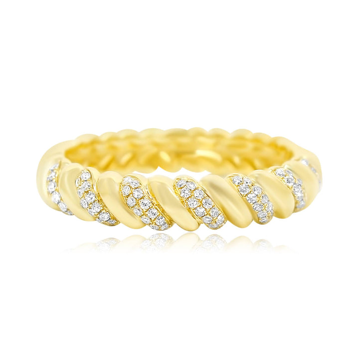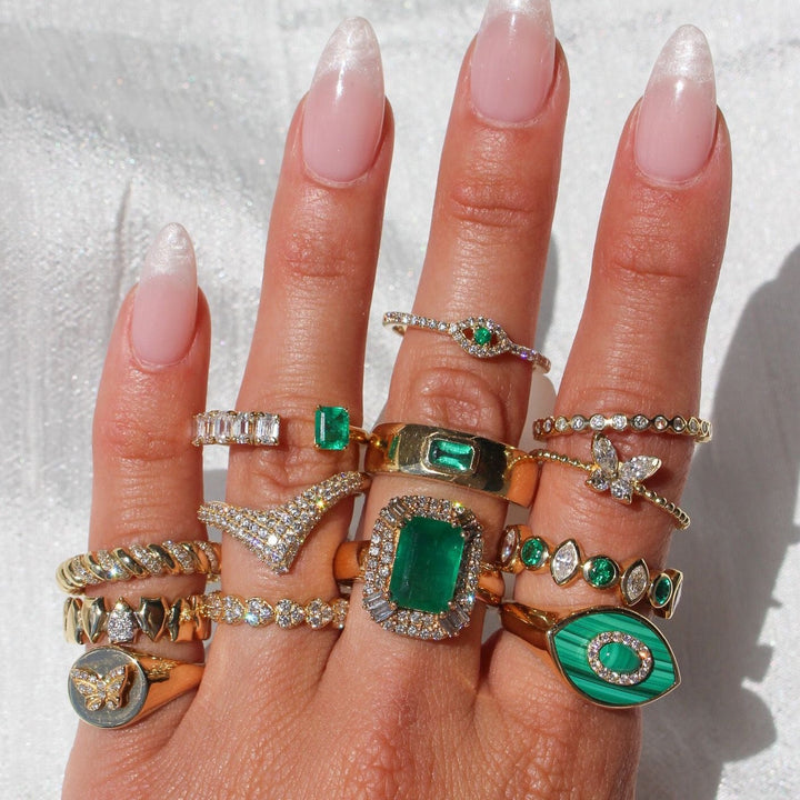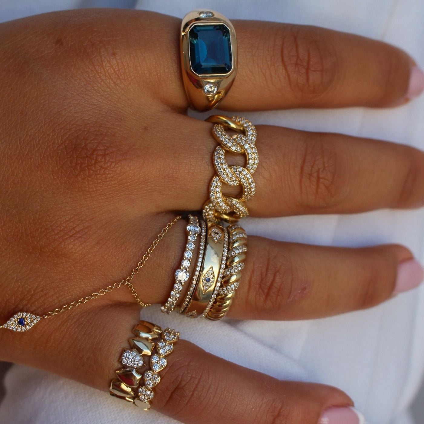 This Gold Croissant Diamond Eternity Ring by Monisha Melwani offers a unique twist on the classic eternity ring, with its croissant-inspired design and sparkling diamonds. Ideal for those who appreciate bold yet elegant jewelry, this ring is a perfect statement piece.