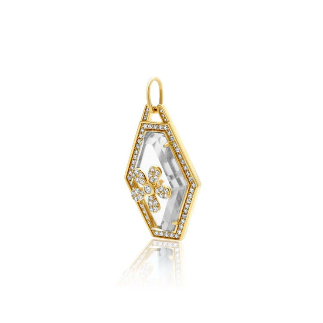 This Gold Crystal Diamond Flower Pendant by Monisha Melwani is a stunning piece that combines the beauty of white topaz and diamonds in a flower-inspired design. Ideal for making a bold statement, this pendant is perfect for adding a touch of glamour to any outfit.
