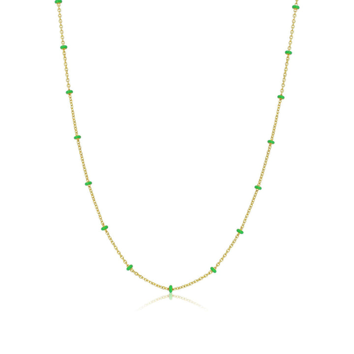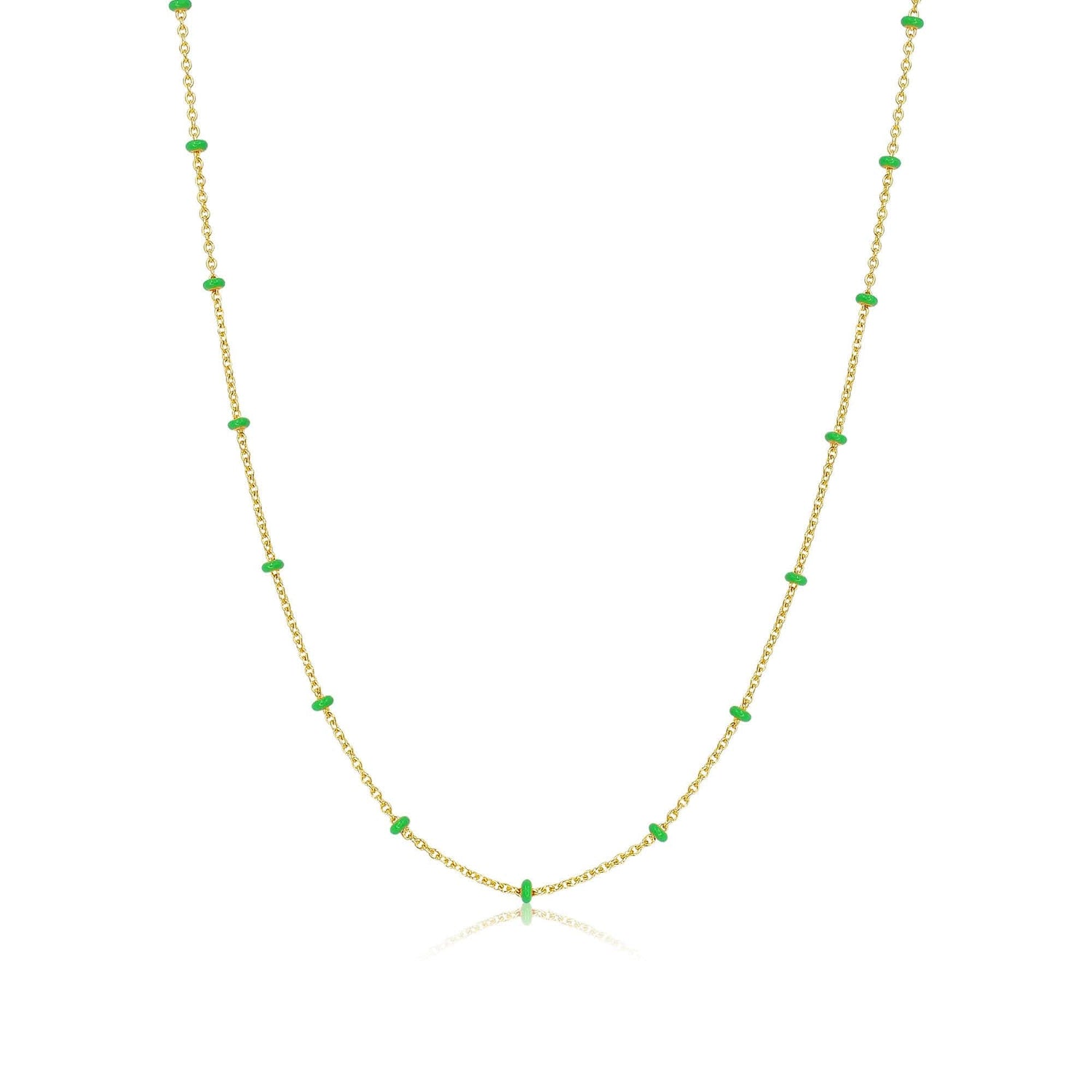 Handcrafted in 14KT gold, featuring green enamel. The necklace measures 16 inches with a 2-inch extension.