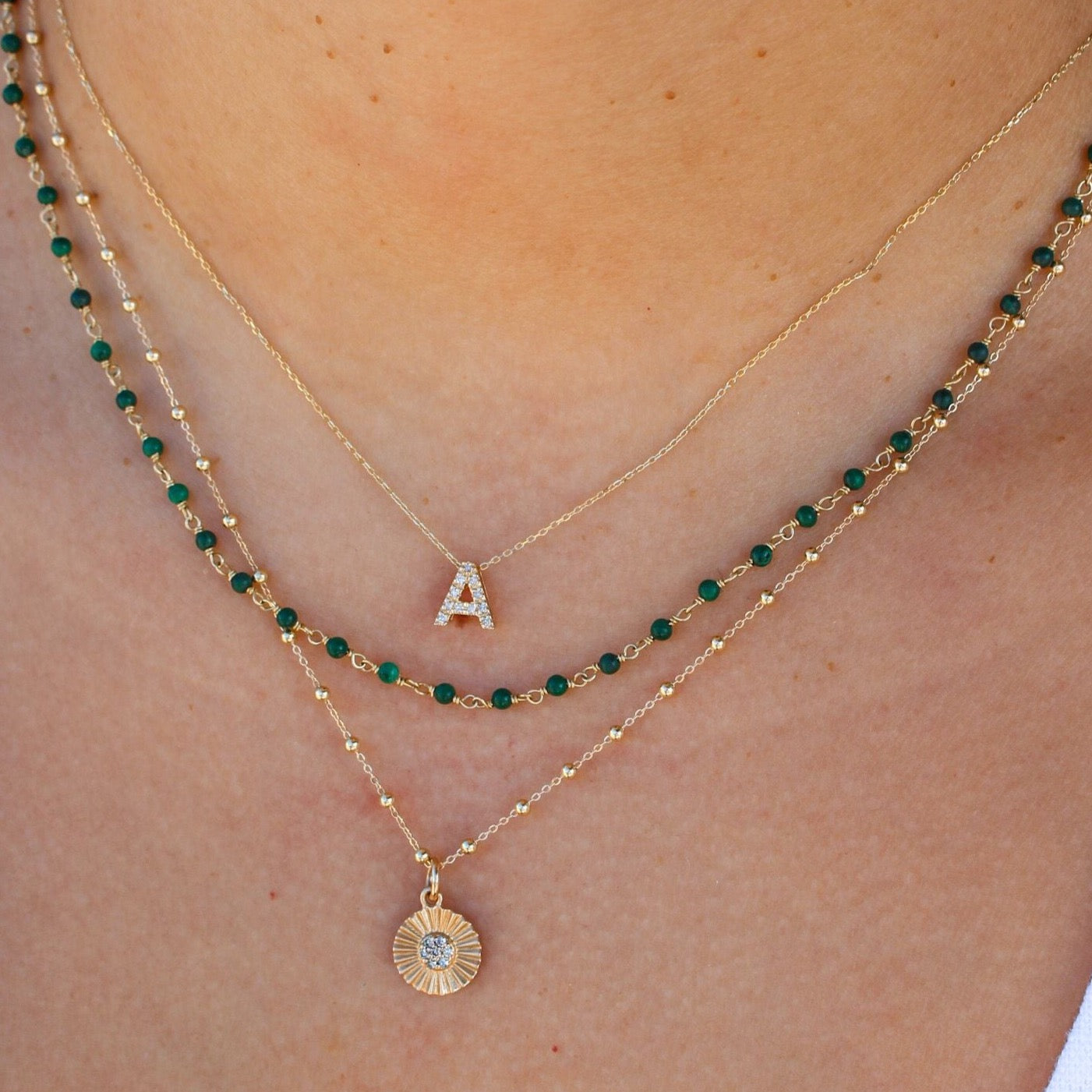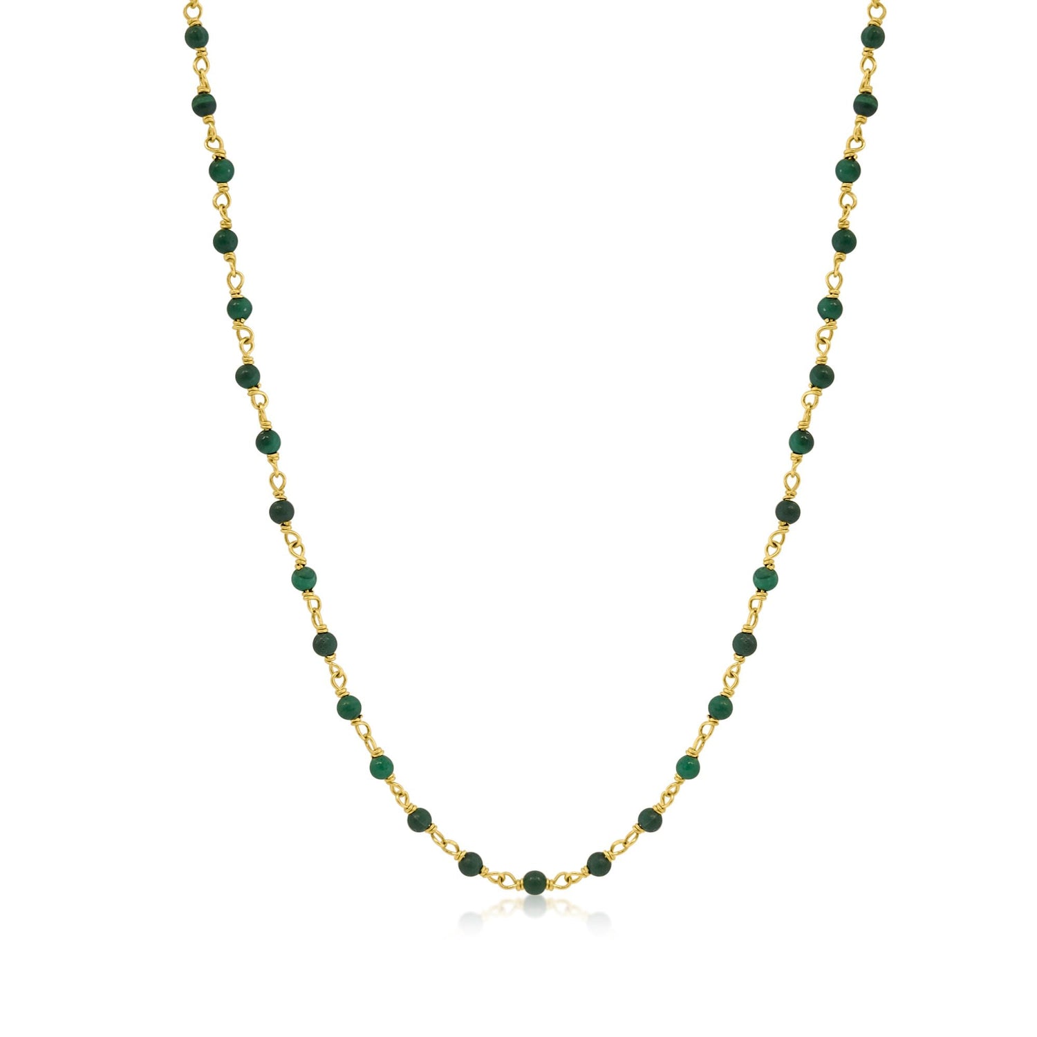 This Gold Dainty Malachite Necklace by Monisha Melwani features the striking green hue of malachite, offering a subtle yet luxurious touch to your everyday style. Its delicate design makes it ideal for layering or wearing on its own for a minimalist look.