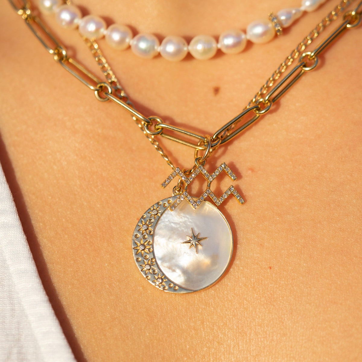 This Gold Diamond Aquarius Zodiac Pendant by Monisha Melwani is a personalized and luxurious piece, featuring sparkling diamonds in a zodiac design. Perfect for astrology lovers, this pendant adds a meaningful touch to any jewelry collection.