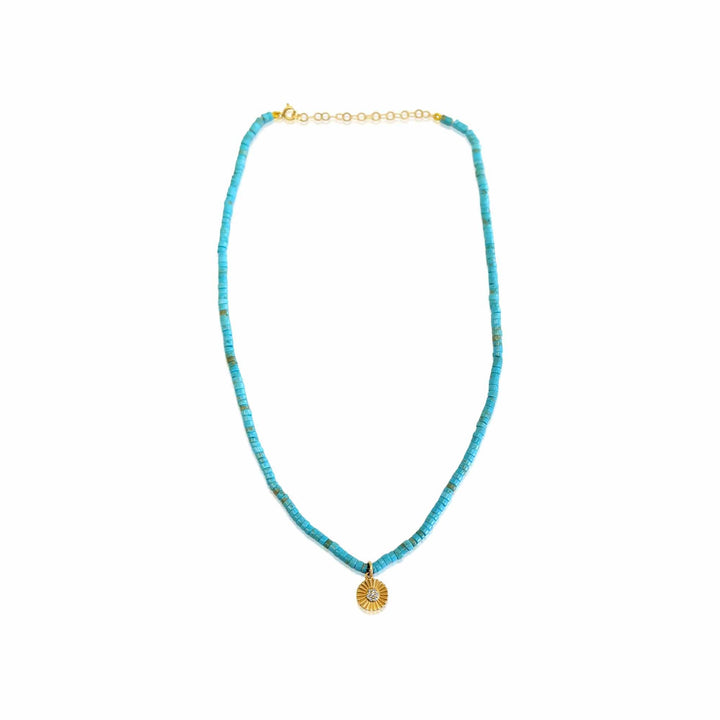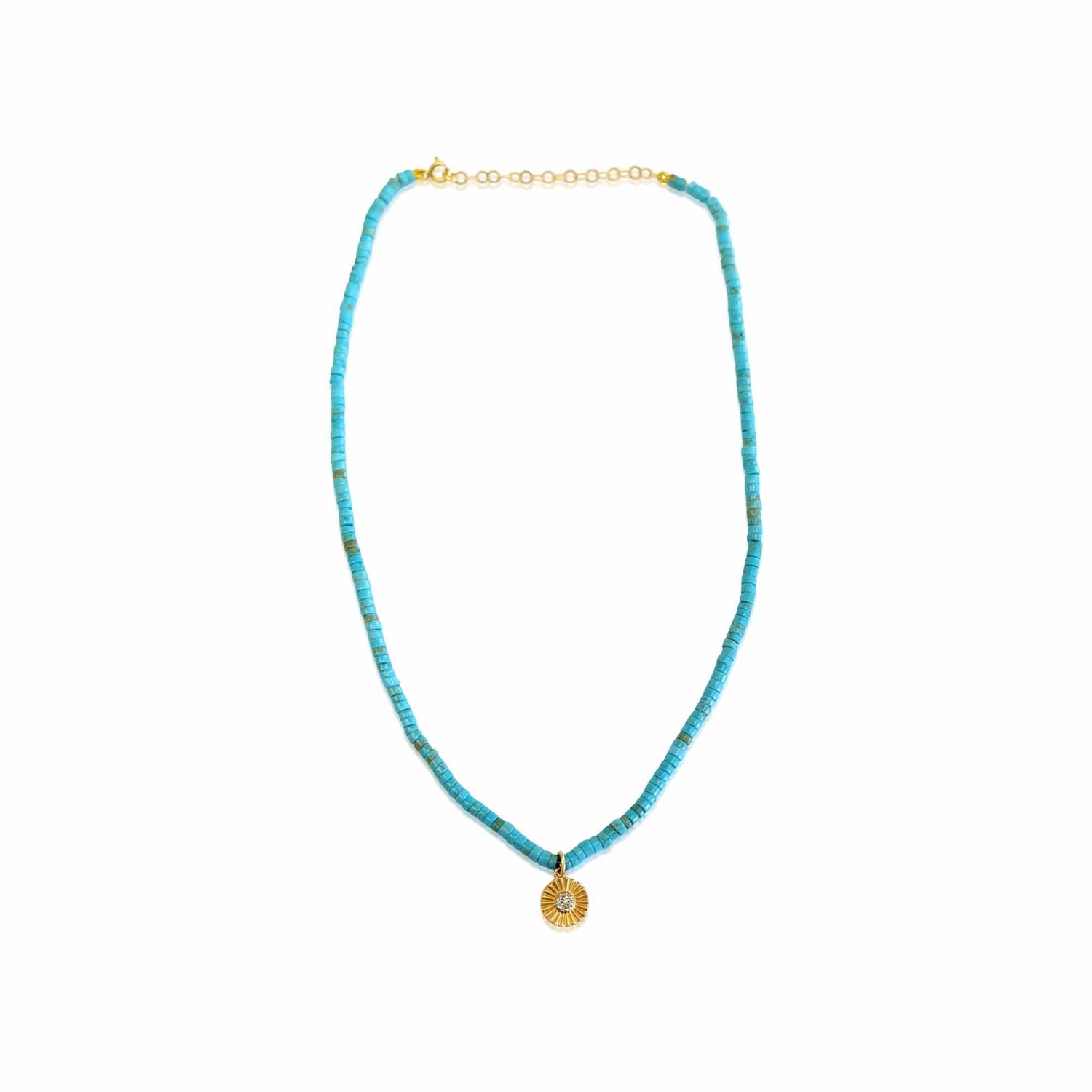 This Gold Diamond Charm Turquoise Beaded Necklace by Monisha Melwani — A vibrant and stylish necklace featuring genuine turquoise beads accented by a gold diamond charm. The combination of turquoise and diamonds creates a striking contrast, making it a bold statement piece. Adjustable in length, this necklace is perfect for layering or wearing solo.