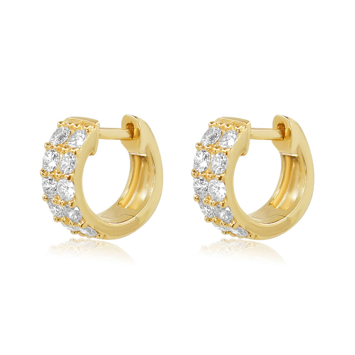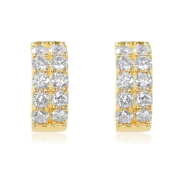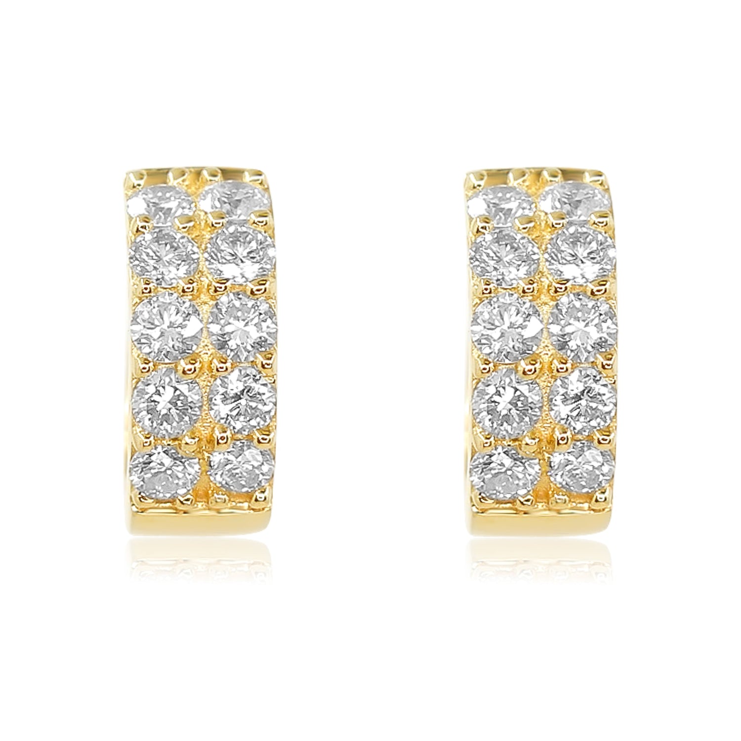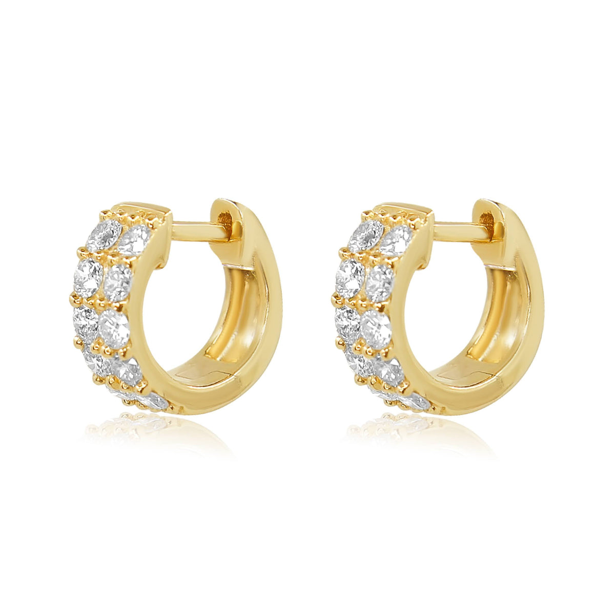 This Gold Diamond Double Line Chunky Hoop Earring by Monisha Melwani — A bold and luxurious hoop earring featuring two rows of brilliant diamonds. The chunky design makes a striking statement, while the diamond accents add a touch of sparkle, perfect for day or evening wear. Sold as a single for a modern, asymmetric look.