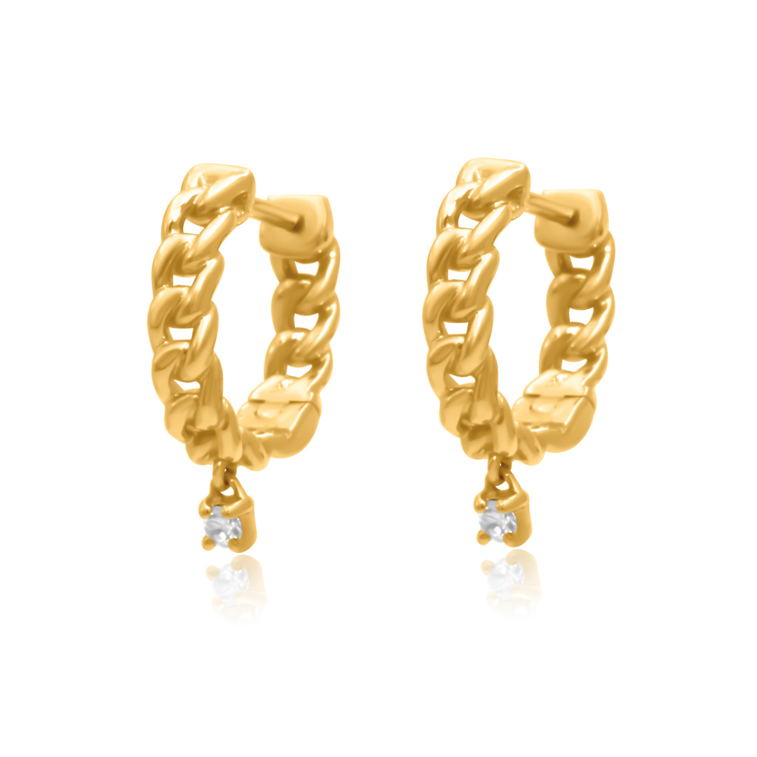 This Gold Diamond Drop Cuban Link Hoop Earring by Monisha Melwani — Featuring a classic Cuban link design with a modern twist, this hoop earring is adorned with diamonds, offering a blend of elegance and edginess. Perfect for those who appreciate unique, fashion-forward jewelry. Sold as a single for a striking statement look.