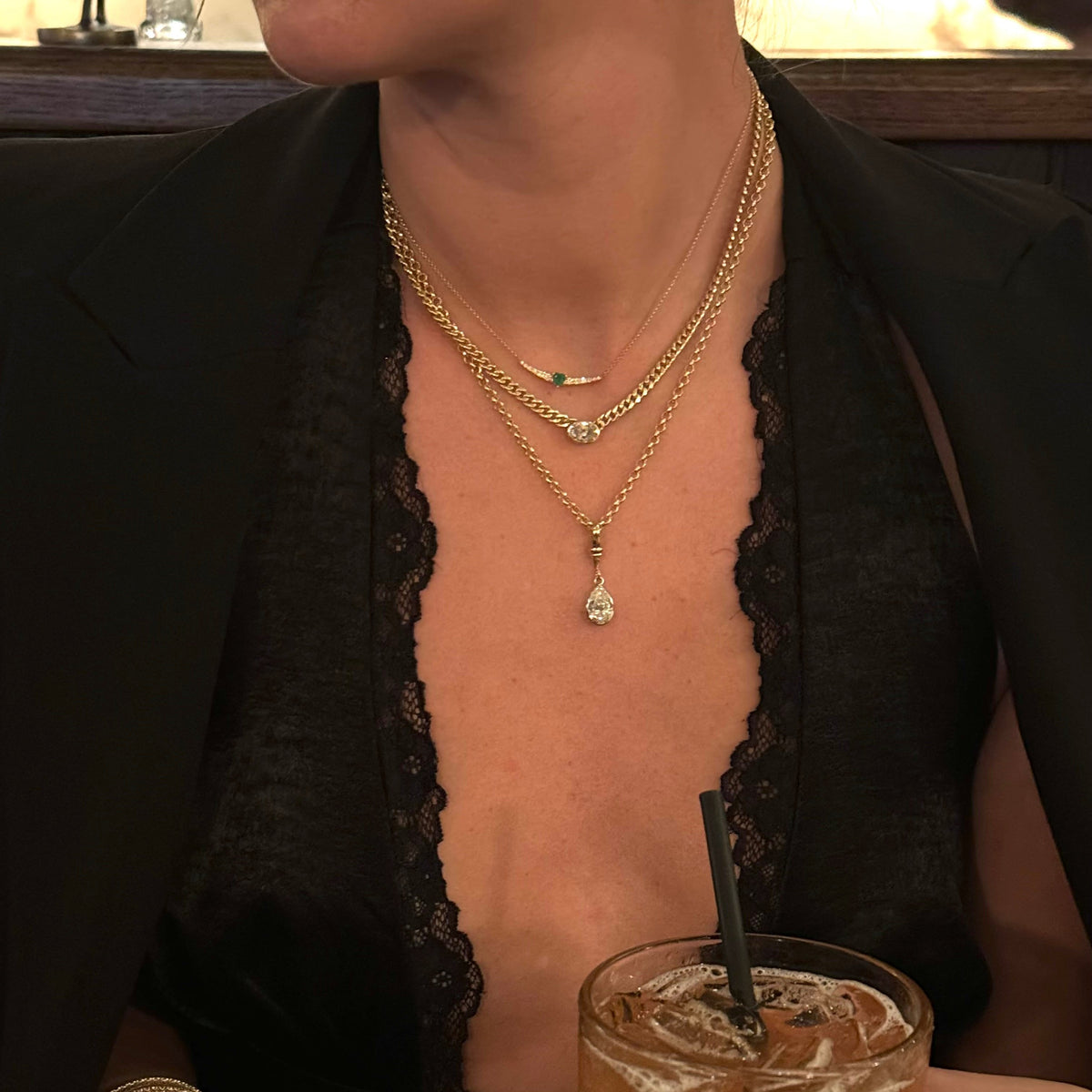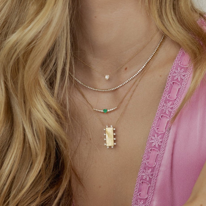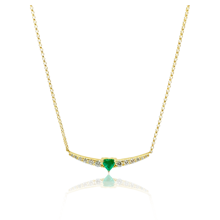 This Gold Diamond Emerald Bar Curve Necklace by Monisha Melwani — A sophisticated and modern design, this necklace features a curved bar adorned with diamonds and emeralds, adding a touch of color and elegance to any outfit. The adjustable length makes it perfect for layering or wearing alone for a chic look.